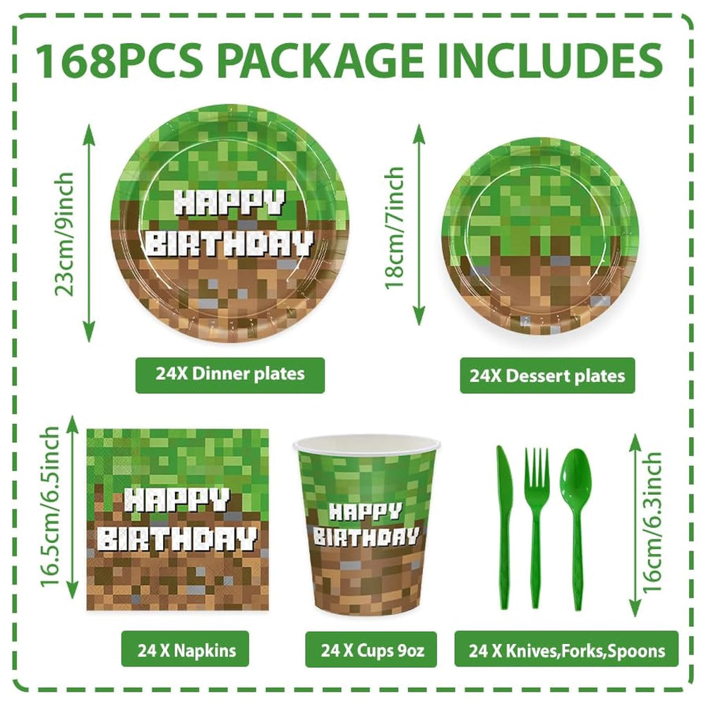 | Birthday Party Supplies: You Will Receive 24Pcs 9Inch Dinner Plates, 24Pcs 7Inch Dessert Plates, 24Pcs 6.5Inch Napkins, 24Pcs Paper Cups, 24Pcs Green Knives, Forks And Spoons, 168 Pieces In Total, Specially Made For Green Theme Birthday Decorations, Which Will Not Only Attract Your Guests, But Also Meet Your Green Theme Party Decoration Needs. | | Unique Design: The Green Birthday Party Supplies Tableware Set Features With Vibrant Green, Mimicking Realistic Patterns, The Dinner Of Plates, Napkins And Cups Printed With "Happy Birthday", Which Leading You To Immerse Yourself In Game Reverie! | | High Quality Material: Our Plates Napkins Are Made Of High Quality Paper Materials, Food - Grade Materials, Non-Toxic, Odorless, Light, Won'T Fold, Break Easily, Which Is Very Suitable For Dessert, Party Food, Providing Safety And Durability. | | Easy To Clean: You Can Easily Hold A Green Themed Party With Our Party Supplies That Will Impress Your Guests All Night Long. You Can Throw Them Into Trash Can Directly After Party, Which Is Very Convenient. You Can Save A Lot Of Time To Clean And Enjoy Party Time With Family And Friends. | | Wide Applications: Our Party Supplies Can Be Used For Game Parties, Game-Themed Birthday Parties, Video Game Competitions, Green Theme Parties. They Bring A Party Full Of Gaming Atmosphere And I Believe That You And Your Family Will Have A Pleasant Experience? | |