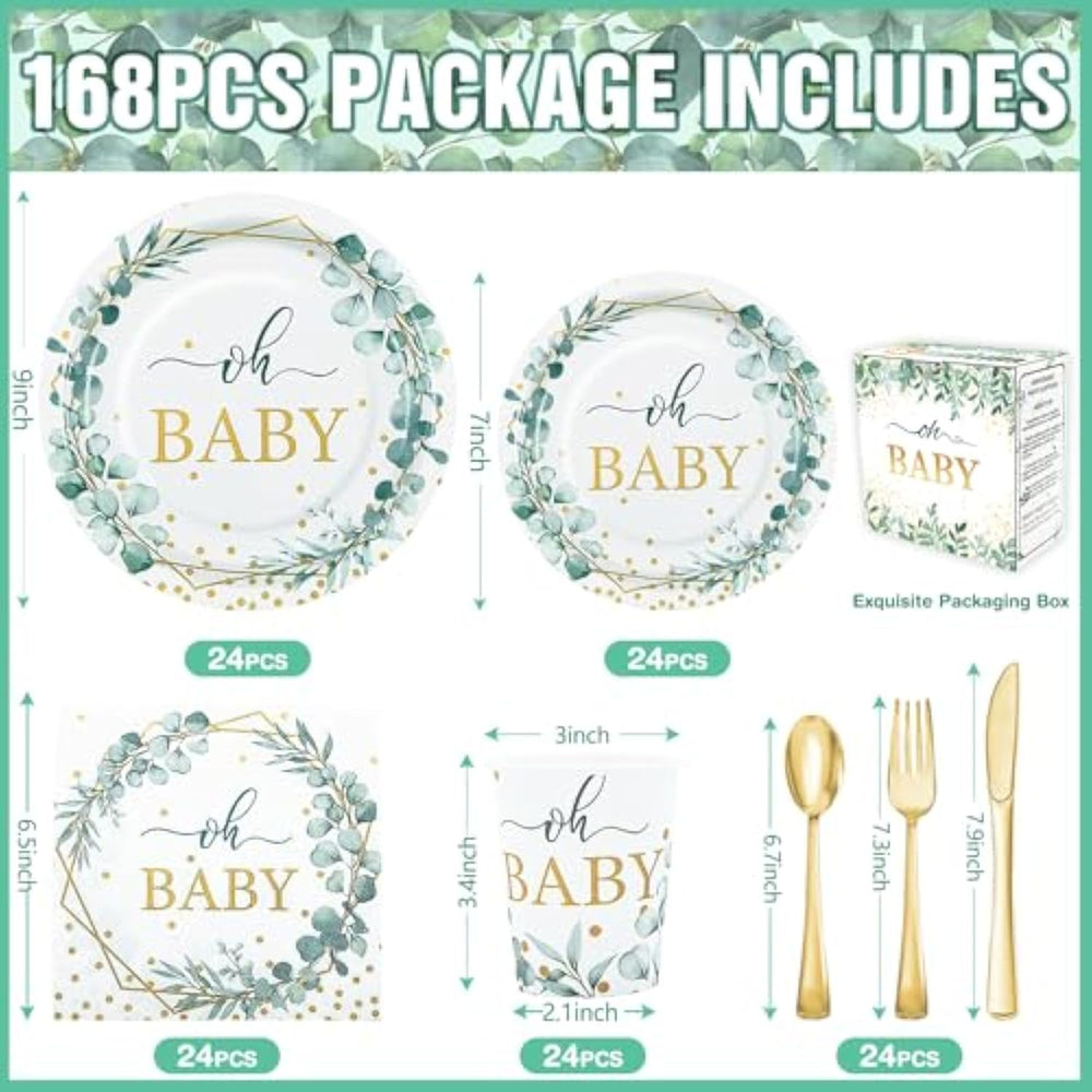 This 168-piece sage green baby shower tableware set features a eucalyptus leaf and gold dot "Oh Baby" design, creating a charming boho and gender-neutral theme. It includes 9-inch and 7-inch plates, cups, napkins, and plastic utensils for 24 guests. Designed for durability, the thickened plates resist bending and leaks, while the raised edges prevent spills. The double-layer napkins offer strong absorption without fading. Made from 100% food-grade, non-toxic materials, this disposable and recyclable dinnerware set ensures effortless cleanup, allowing you to enjoy more time with loved ones.