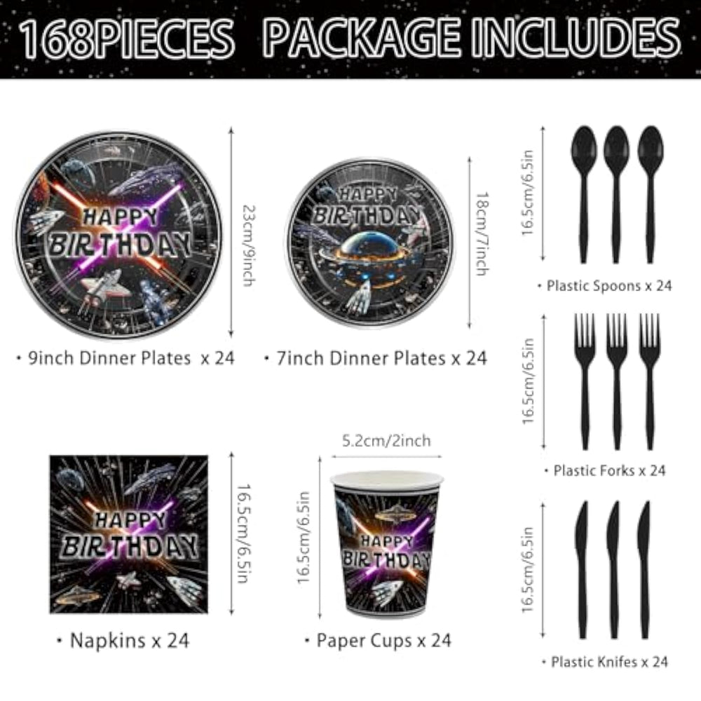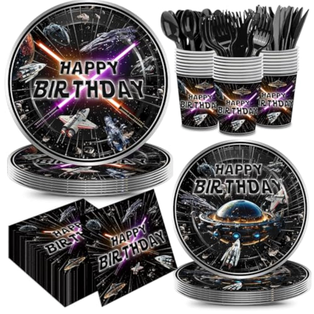 | Star Birthday Party Supplies: The Galaxy Movie Star Party Decorations Include 24Pcs 9 Inch Dinner Plates, 24Pcs 7 Inch Dessert Plates, 24Pcs 6.5 Inch Napkins, 24Pcs Black Knives, Forks And Spoons. The Quantity Is Enough To Meet Your Party Use And Replacement Needs, Star Party Supplies Will Be The Best Choice For Your Party. | | Galaxy Movie Star Design: Our Star Party Suppies Feature A Black Background, Printed With Galaxy Movie Star Theme Pattern Such As Galaxy, Star, Laser, Meteorite And So On, The Dinner Of Plates, Napkins And Cups Printed With "Happy Birthday", Which Leading You To Immerse Yourself In Space Reverie! | | High Quality Material: Our Star Plates Napkins Are Made Of High Quality Paper Materials, Food - Grade Materials, Non-Toxic, Odorless, Light, Won'T Fold, Break Easily, Which Is Very Suitable For Dessert, Party Food, Providing Safety And Durability. | | Save Your Time: The Star Party Supplies Are Environmental Friendly, You Can Throw Them Into Trash Can Directly After Party, Which Is Very Convenient. You Can Save A Lot Of Time To Clean And Enjoy Party Time With Family And Friends, Making Your Party More Interesting. | | Wide Applications: The Galaxy Movie Star Party Decorations Are Perfect For Universe Theme Parties, Mens Birthday Party, Star Party, Boys Birthday Party, Space Theme Party, Outdoor Event Decor, Kids' Parties, School Celebrations, And Family Gatherings. These Star Party Decorations Can Transform Any Space Into A Thrilling Outer Space Atmosphere, Both Indoors And Outdoors. | |