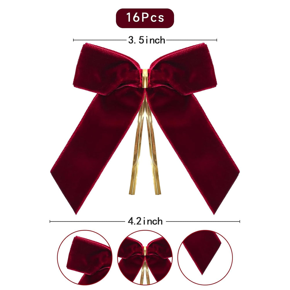 | Package Contents: Set Of 16 Elegant Red Velvet Bows With Gold Twist Ties, Perfect For Holiday Decorating And Gift Wrapping Needs | | Dimensions: Each Bow Measures 3.5 X 3.5 Inches With A 1-Inch Width, Ideal Size For Christmas Trees, Wreaths, And Gift Packaging | | Versatile Use: Suitable For Christmas Tree Ornaments, Wreath Decorations, Gift Wrapping, Craft Projects, Wedding Decor, And Party Favors | | Premium Material: Made With High-Quality Velvet Fabric That Provides A Luxurious Look And Rich Texture For Sophisticated Holiday Decorating | | Easy Application: Pre-Made Bows Feature Convenient Twist Ties For Quick And Secure Attachment To Various Surfaces And Items | |