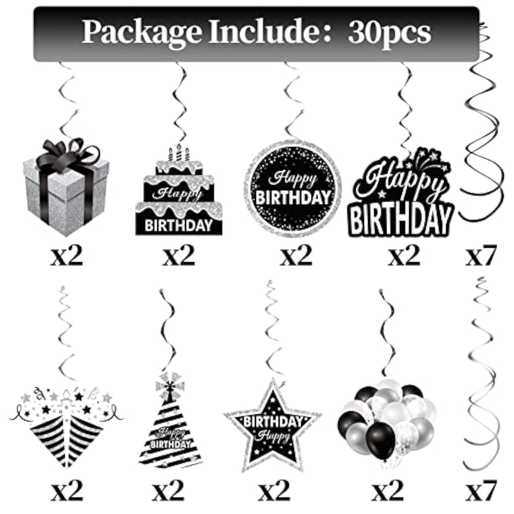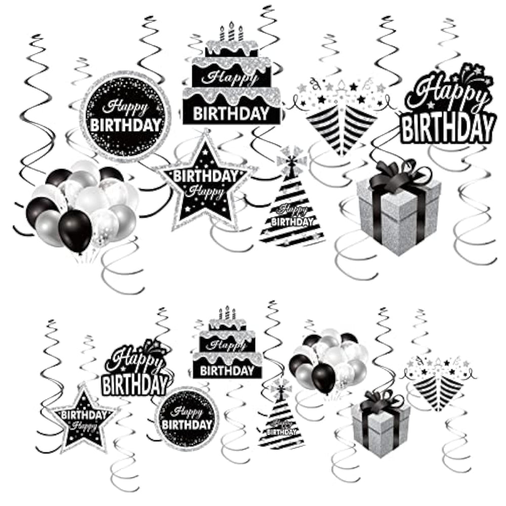 You'll get 16 pieces of Black, White, and Silver Birthday Hanging Swirls Decorations, designed to create a vibrant party atmosphere with a variety of rich and exciting patterns. This classic black, white, and silver color scheme is perfect for both men's and women's birthday parties, offering a stylish and neutral touch. The decorations feature a range of charming patterns, including cakes, balloons, stars, and gift boxes, ensuring that everyone at the party will be delighted. These versatile swirls are suitable for birthday celebrations of any age—whether it’s for a 10th, 16th, 18th, 21st, or any milestone birthday. Hang them on ceilings, windows, doorways, or use them as photo props to make your party unforgettable.
