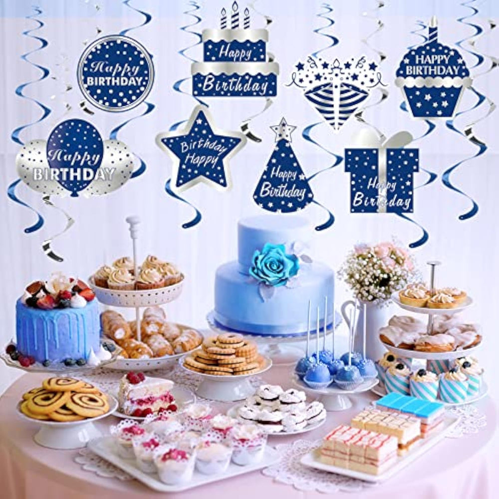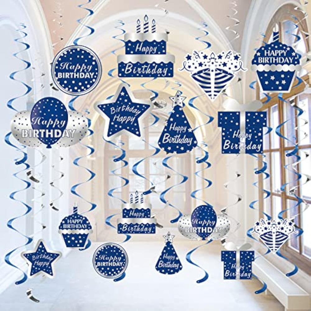 This 16-piece blue and silver hanging swirl decoration set is perfect for creating a festive atmosphere at birthday celebrations for any age, including 16th, 21st, 30th, 40th, 50th, 60th, 70th, and 80th birthdays. The set features a double-sided design with classic blue and silver colors, incorporating eight personalized birthday elements such as hats, numbers, and cakes. Each swirl comes pre-assembled with a plastic hook, making them easy to hang on ceilings, windows, buffet tables, gift tables, or doorways. These decorations not only enhance the party ambiance but also serve as excellent photo backdrops and props.