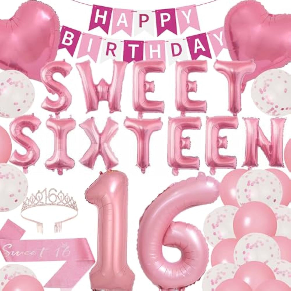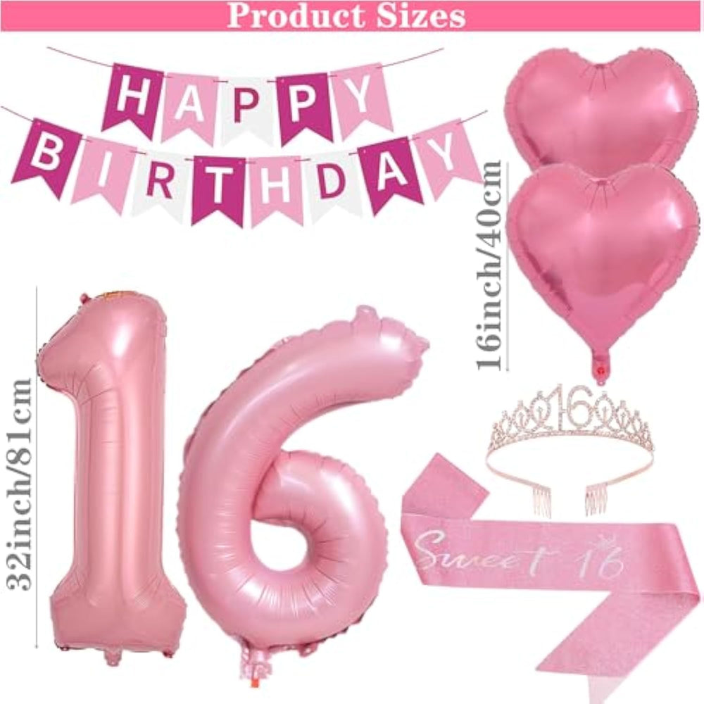 | 16Th Birthday Party Decoration: 16Inch Pink Letter Balloons Banner "Sweet Sixteen", 32Inch Number Balloons "16", 2 Pcs 18Inch Heart Balloons, Pink Happy Birthday Banner, 1Pc Sweet 16 Sash, 1 Pc Sparkling 16Th Tiara, 20 Pcs Latex Balloons, 1 Pc 10M Balloon Ribbon, Make Your 16 Years Old Birthday Party Very Special. | | 16 Years Old Party Supplies: Pink Themed Party, Including Exquisite Balloons, Delicate Paper Banner, Sparkling Crown And Sash, 32 Inch Number Balloons "16", Will Give You A Memorable 16Th Birthday Celebration. | | Quality Material: Our Balloons Are Made Of Quality Materials, Latex Or Aluminum Foil, Which Are Not Easy To Tear, You Don'T Have To Worry About Sudden Breakage Or Bursting. They Will Remain Inflated Until The Festivities Are Over. | | Easy To Inflate: You Can Easily Inflate These Balloons By Yourself Using The Straw Or Balloon Inflator. Please Note That Foil Balloons Are Not Designed To Float With Helium. But You Can Attach Them To The Wall With The String Or Double-Sided Tape. Latex Balloons Can Float With Helium Gas. (In Order To Avoid The Balloon Bursting Due To Overinflation, Please Gently Inflate The Aluminum Foil Balloon To 80% Through The Self-Sealing Port.) | | Wide Application: This 16 Years Old Birthday Party Decorations Are Suitable For Hanging Anywhere In The Party Space. Create A Stunning Look On Walls, Ceilings, Tables, Windows, Bedrooms And More. Make Your 16Th Birthday Party Special And Memorable! And It Also Serves As A Beautiful Great Background Photo Props For The Party. | |
