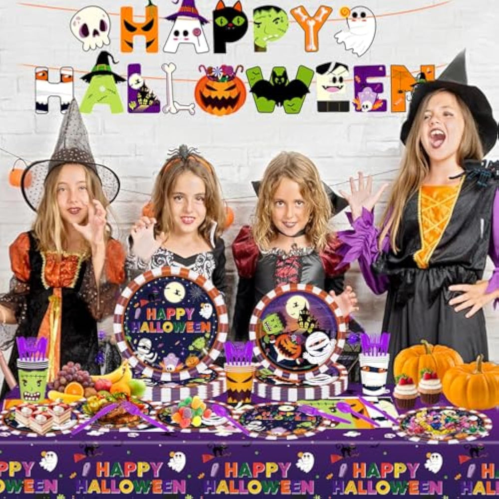 Throw an unforgettable Halloween celebration with this 170-piece Halloween Party Supplies Set, featuring everything you need for a complete and festive table setup. The set includes a Happy Halloween banner, 24 9-inch plates, 20 7-inch plates, 24 napkins, 24 cups, 24 forks, 24 spoons, 24 knives, and 1 large Halloween tablecloth, offering both practicality and style. Each piece is adorned with intricate Halloween-themed designs, adding a spooky and fun atmosphere to your party. Made from high-quality, eco-friendly paper, the plates, cups, and napkins are durable and safe for food, while the spill-proof, stain-resistant tablecloth ensures easy cleanup. Perfect for Halloween parties, haunted houses, vampire-themed dinners, or home décor, this set combines convenience, festive charm, and long-lasting enjoyment, with the banner reusable for multiple celebrations.