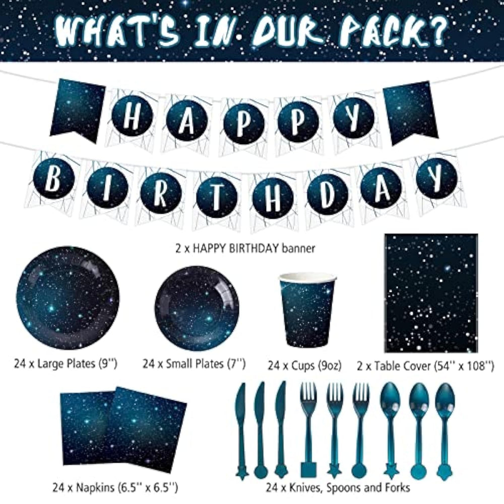 This space-themed birthday party set serves 24 guests and includes 24 nine-inch dinner plates, 24 seven-inch dessert plates, 24 nine-ounce cups, 24 galaxy napkins, 24 sets of knives, forks, and spoons, two galaxy planet tablecloths, and two happy birthday banners with ropes. Featuring a vibrant design of planets and stars against a deep blue background with scattered shooting stars, this set creates a dreamy space atmosphere. Made from high-quality paper, the plates and napkins are durable and absorbent, while the tablecloths are lightweight and resistant to tearing and fading. The disposable design makes cleanup quick and hassle-free, allowing you to enjoy more time with friends and family.