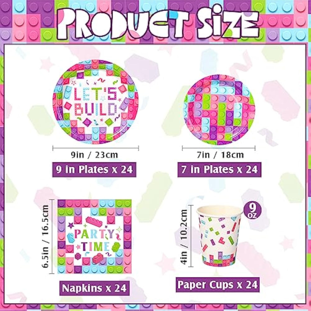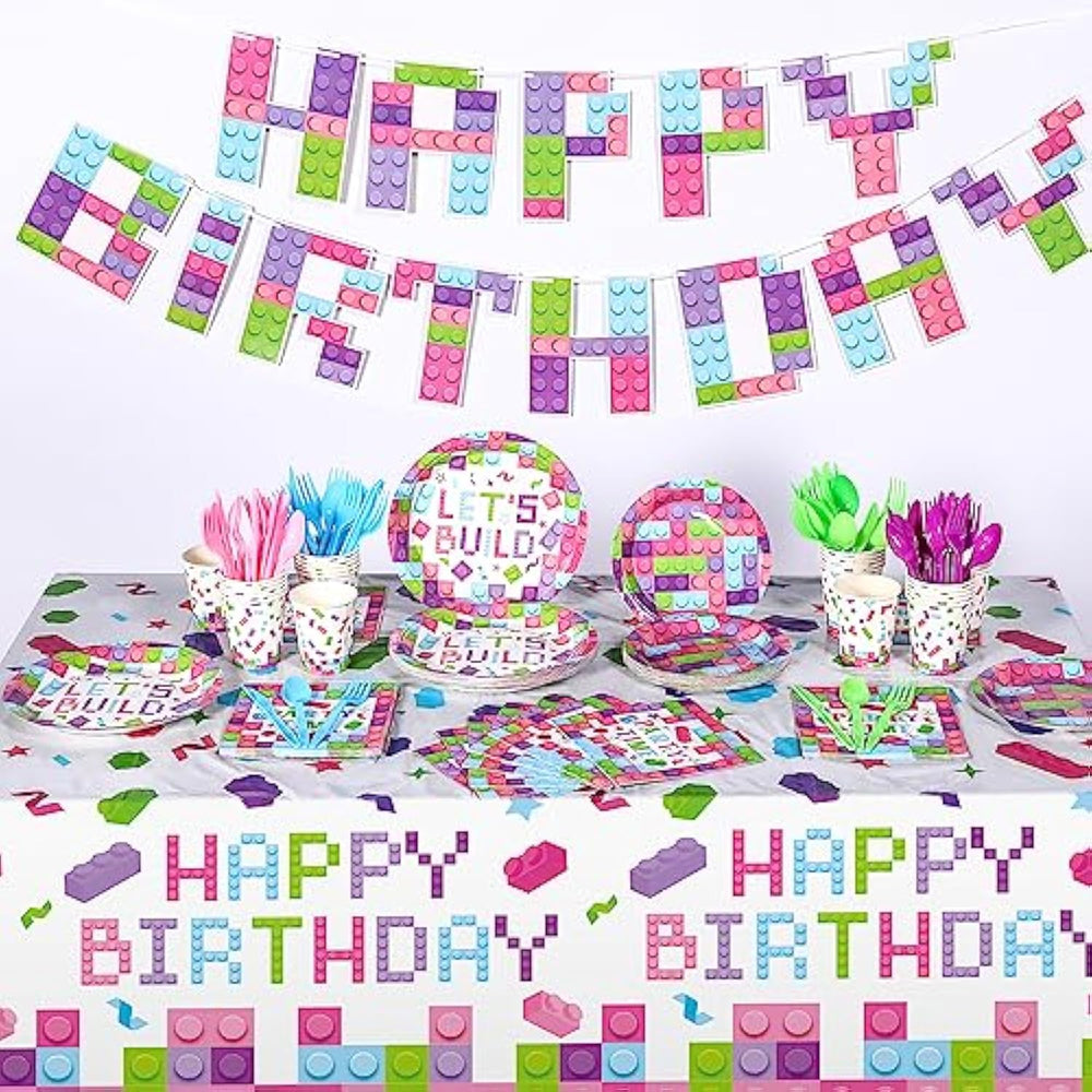 This 171-piece pink building block-themed party set includes everything needed for a fun and colorful celebration, featuring 24 paper dinner plates, 24 dessert plates, 24 napkins, 24 cups, 24 forks, 24 knives, 24 spoons, a "Happy Birthday" banner, and two tablecloths. Designed with vibrant blue, pink, green, and purple block patterns on a white background, these decorations create a lively atmosphere. Made from high-quality materials, the thick paper plates and cups are sturdy, the napkins are soft and absorbent, and the plastic cutlery and table covers are durable and waterproof. This disposable set ensures easy cleanup, making it a convenient choice for any birthday party.