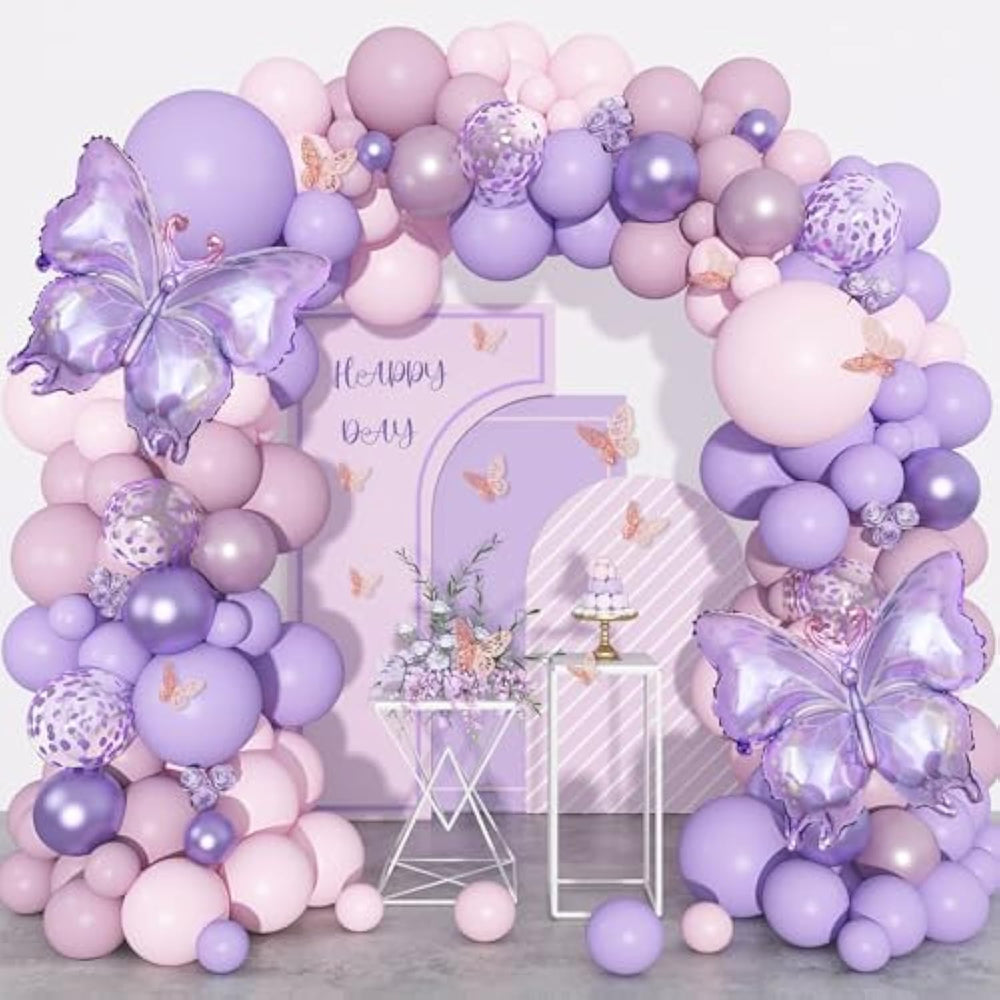 Our butterfly balloon arch kit includes 171 pieces, featuring various sizes of macaron purple, pink, and rose red balloons, along with metallic purple and light purple balloons, confetti balloons, and butterfly-themed decorations. It also comes with two large foil butterflies, a flower balloon, 12 butterfly stickers, and four balloon accessories for easy assembly. Made from high-quality natural latex, these durable balloons ensure long-lasting decor without leaking. The unique butterfly and floral elements, combined with pink and purple hues, make this kit perfect for birthdays, baby showers, weddings, and butterfly-themed parties.