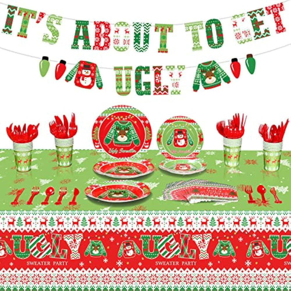 | Christmas Party Supplies Serves 24: Our 172 Pcs Christmas Dinnerware Sets Are Suitable For Up To 24 Guests, Tableware Set Includes: 24 Pcs 9 Inch Disposable Dinner Plates, 24 Pcs 7 Inch Dessert Plates, 24 Pcs Santa Napkins, 24 Pcs Ugly Sweater Cups, 24 Pcs Knifes, 24 Pcs Forks, 24 Pcs Spoons, 2 Pcs Tablecloths, 2 Pcs "It'S About To Get Ugly" Banner, Sufficient To Meet Your Needs For Christmas Dinner; Also We Provide You With 2 Rolls Of Ropes For Easy Hanging | | Christmas Ugly Sweater Design: This Set Of Tableware Is Printed With Christmas Ugly Sweater Pattern And "Ugly Sweaters" Characters, With Novel Christmas Elements, Exquisite And Stylish, Bring A High End And Vibrant Atmosphere To Your Christmas Party | | Reliable Material: All The Plates And Napkins Are Made Of Thick Paper, Tablecloths Are Made Of Plastic, Which Are Reliable, Waterproof, Strong Enough To Hold A Full Plate Of Food And Can Simply Throw Them Out After An Event Or A Party | | Protecting Your Surfaces: Christmas Plastic Tablecloths To Keep Your Tables Stain Free From Spilled Milk, Juice Or Soda And Spoons And Avoid Scratches From Any Objects Like Crayons, Markers And Glue, Enjoy More Xmas Time With Your Families And Friend | | Widely Uses: The Selection Of Christmas Ugly Sweater Decorations Makes Your Christmas Party Distinctive, Ideal For Christmas Party, Christmas Decorations, Holiday, New Year Dinner, Family Gatherings And Any Christmas Themed Parties; Serve Dinner To Guests In Catering, Buffet, Potluck, Events Or Daily Meals | |