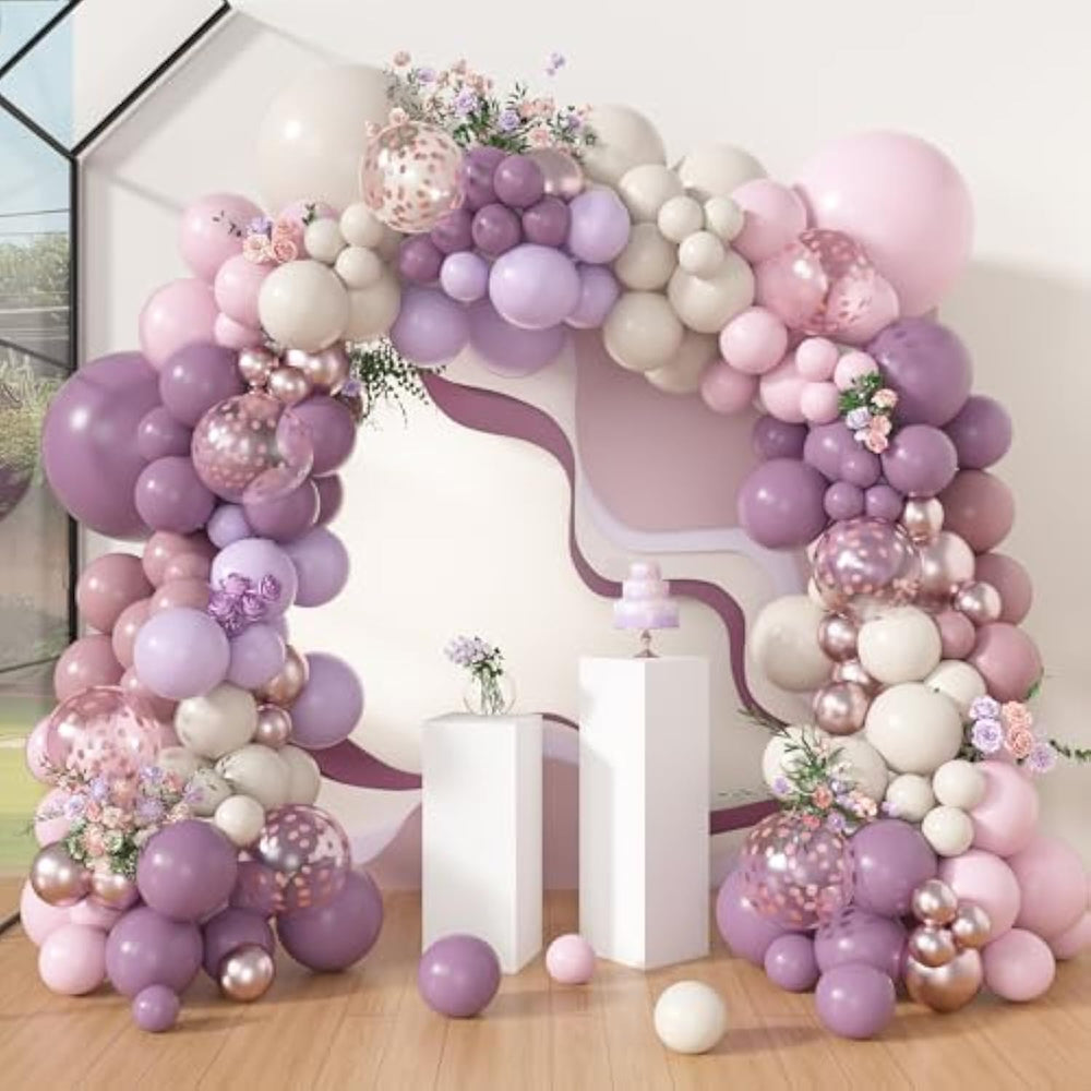 Purple Balloon Arch Kit: 3 Pcs 18" White Sand/Double-Stuffed Pink/Dusty Purple Balloons, 22 Pcs 12" Rose Gold Confetti/Dusty Purple/White Sand/Double-Stuffed Pink Balloons, 60 Pcs 10" Metallic Rose Gold/Dusty Purple/White Sand/Double-Stuffed Pink/Mauve/Light Purple Balloons, 56 Pcs 5" Dusty Purple/Double-Stuffed Pink/Lavender Balloons/Dusty Pink/White Sand Balloons And 4 Pcs Balloon Tools | Versatile Use: Pink And Purple Balloons Can Be Used In Multiple Occasions, Providing With Desired Party Background For Your Photos; Lilac Balloons Fit Into Multiple Themes And Settings Like Celebrating The Impending Arrival Of A New Baby, Saying "I Do," Or Honoring A Bride-To-Be Or The Mother-To-Be, Butterfly Birthday Decorations, Butterfly Party Decorations, Lavender Birthday Decorations, Etc | Stunning Backdrop: A Beautifully Arranged Purple Balloon Arch Serves As An Eye-Catching Focal Point For Photos; Guests Will Be Drawn To Its Charm And Will Love Capturing Memories In Front Of This Enchanting Display; Add Flowers Or Greenery Among The Lavender Balloons To Enrich The Natural Vibe And Add Texture To Your Display | Decent Quality: Our Purple Balloon Garland Is Made Of Fine Latex Materials, Which Can Last For A Few Hours And Not Easy To Damage; Everything Has Surprising Quality And Looks Great; Add Nice Touch To The Party Place And Make Celebrations More Cheerful And Memorable Using This Lavender Balloon Arch Kit | Easy To Use: There'S An Amount Of Pink And Purple Balloons For Making A Butterfly Balloon Arch Kit; White Sand Balloons Are Easy To Blow; Use Balloon Tools To Help You Build A Bridal Shower Balloon Arch Quickly And Easily; You Just Need To Blow Double Stuffed Balloons With The Air Or Helium, And Then Fix Them Together With The Balloon Strip |