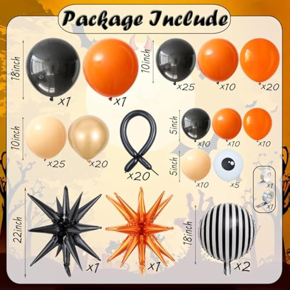 This Halloween balloon set includes 174 balloons in black, orange, apricot, and metallic gold, along with 2 explosion star foils, 2 striped foils, 20 long balloons, 5 eye balloons, plus garland strip, straw, and glue dots for easy setup. Made from non-toxic, durable latex, the balloons can be filled with air or helium and maintain bright colors for a festive look. Simply inflate, attach to the strip, and hang to create arches or garlands, with the option to add ribbons, greenery, or tulle for extra flair. Perfect for Halloween parties, haunted houses, birthdays, photo backdrops, or themed events, these decorations instantly transform any space. For best results, inflate close to event time, avoid overfilling, and store unused balloons in sealed bags.