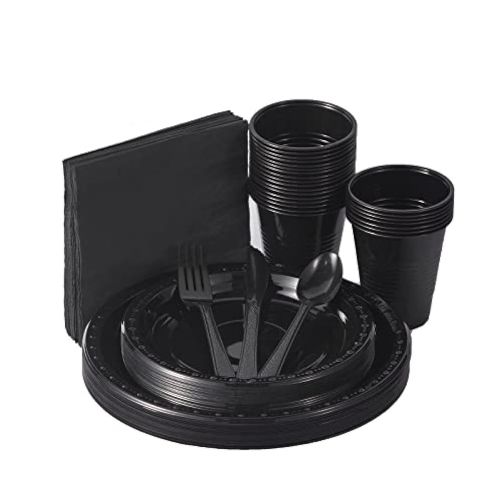 Kit For 25 Guests - This Fancy Plastic Party Dinnerware Set Comes With 25 Pieces Of 10.25" Dinner Plates, 25 Pieces Of 8" Dessert Plates, 25 Pieces Of 12 Oz Cups And 25 13" Beverage Napkins (2-Ply And Measuring 6.5" X 6.5"), 25 Sets Of Heavy Duty Black Plastic Utensils (25 Forks, 25 Spoons, 25 Knives). | High Quality And Elegant Design - This Party Supplies Pack Is Designed With Black Pattern, Bring A High-End And Elegant Atmosphere To Your Party. All The Products Are Made Of Bpa Free, Non-Toxic And Tasteless 100% Food-Grade Paper And Plastic. The Plates Are High Load-Bearing, The Knives, Forks, And Spoons Will Not Bend, Break. Bright Color, High-Grade Feeling. | Convenient And Easy Clean-Up - Save Clean Up Time By Throwing The Plates Cups Napkins And Plastic Cutlery Out After Use. Plastic Flatware Set Is Heavy-Duty, Can Be Cleaned And Stored. If You Need To Reuse These Disposable Plates Again, You Can Wash Them Easily And Have Them Looking Like New For The Next Party, Will Still Enjoy The Decorative And Elegant Accent They Add To Your Event. | Perfect For Your Any Occassion - Take The Headache Out Of Matching Disposable Plates And Plastic Ware Utensils. Use These Black Tableware Items For Christmas Parties, Summer Picnics, Birthday Parties, Festivals, Upgrading Halloween, Wedding Engagement, Graduation Banquet, Family Dinner, Etc.They Are A Great Choice For Christmas And Other Events To Make Cleanup Easy And Look Great. | No Need To Find Matching Sets - We Get That It'S Hard To Find The Perfect Baby Shower Plates Or Disposable Utensils All In One Place. Now The Perfect Place Settings Is All Here In One Easy Package. Hosting A Party For Friends And Family Just Got Easier With This Luxe Black Tableware Kit For 25 Guests Which Includes All The Essentials For A Stress-Free Event. |