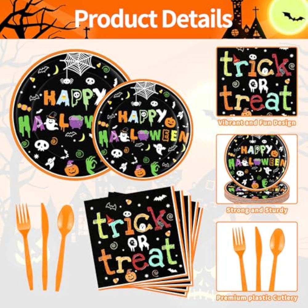 Make your Halloween celebration both festive and effortless with this 175-piece Halloween Party Supplies Set, perfect for serving up to 25 guests. The set includes 25 9-inch dinner plates, 25 7-inch dessert plates, 25 paper cups, 25 napkins, and 25 each of plastic forks, knives, and spoons, providing everything you need for a complete party setup. Crafted from eco-friendly, sturdy, and non-toxic paper, the plates and cups are durable enough to hold candy, snacks, desserts, and both hot and cold drinks, while the disposable design makes cleanup a breeze. Featuring fun and spooky Halloween-themed designs with “Happy Halloween” text and colorful illustrations, this set instantly creates a lively and festive atmosphere for parties, trick-or-treat events, haunted houses, school celebrations, office parties, or spooky birthday gatherings. With durable utensils included, this comprehensive set combines convenience, style, and practicality to make your Halloween unforgettable.