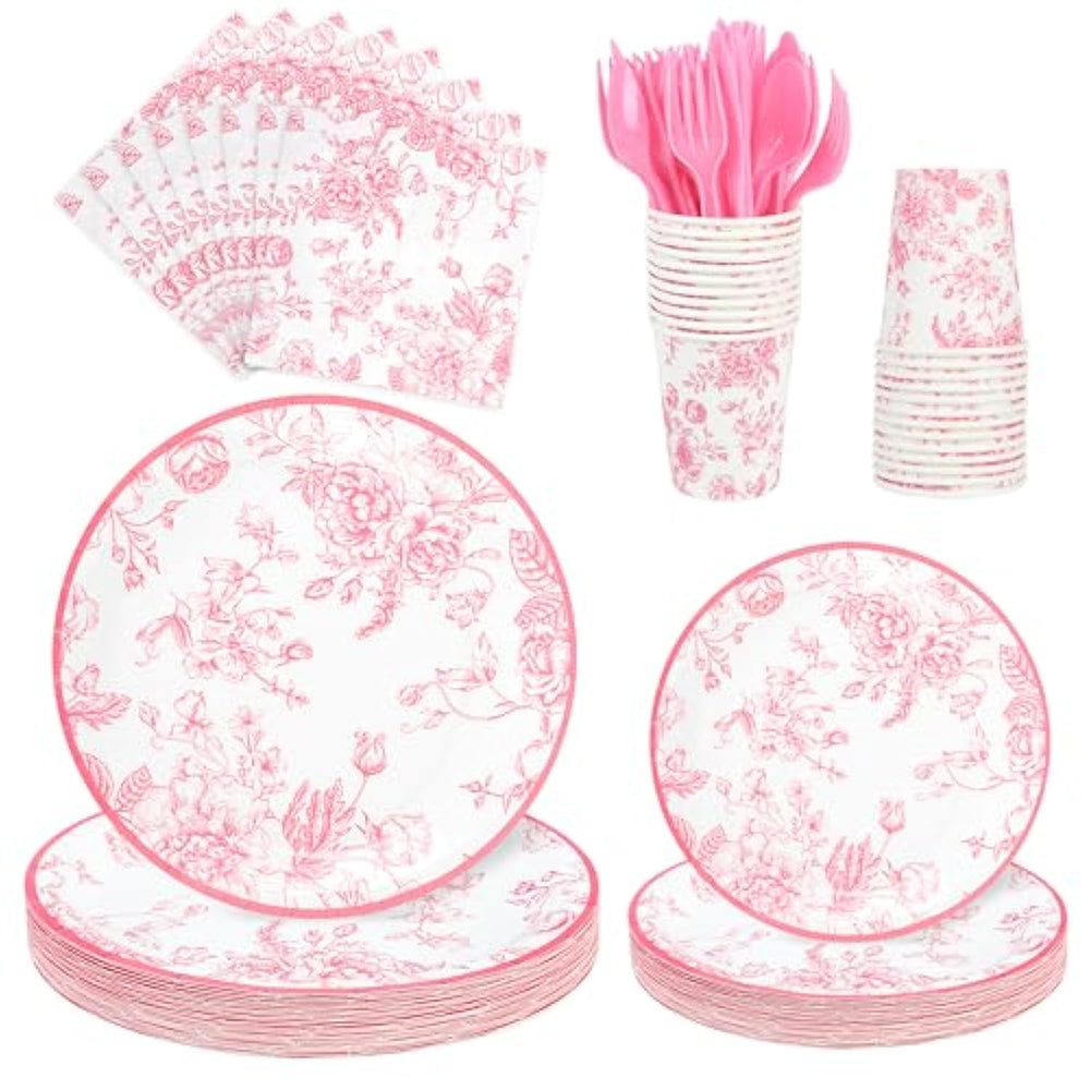 Complete Party Pack For 25 Guests: This 175-Piece Set Includes Everything You Need To Make Your Event Special. It Features 25 9-Inch Dinner Plates And 25 7-Inch Dessert Plates Made Of 350Gsm Paper, 25 9Oz Paper Cups, 25 6.5Inch Napkins, And 25 Plastic Forks, 30 Knives And 25 Tablespoons | Pink Party Dinnerware Set Material: Made Of Thick Paper, These Pink Plates And Napkins Are Perfect For Various Parties, Including Baby Showers, Weddings, And Birthdays. The Elegant Pink And White Floral Print Adds A Touch Of Sophistication To Your Party Decor | Vibrant Pink Floral Design?This Vintage Floral Party Supplies Set Features A Vibrant Pink Floral Design That Is Attractive And Eye-Catching. Every Guest Will Love The Pretty Design, Making It Perfect For Floral Parties, Tea Parties, Bridal Showers And Mother'S Birthdays | Lively And Sparkling Party Decor: These Tableware Sets Bring A Modern Chinoiserie Style To Your Table Setting, Making Your Table Sparkling And Beautiful. These Paper Plates And Napkins Add An Elegant Touch To Any Occasion, Showcg Your Prestige And Glamour | Convenient To Use: Lightweight, Easy To Carry, And Simple To Clear Up After The Event. These Disposable Pink Toile Party Supplies Set Provides A Time-Saving Solution, Allowing You To Spend More Time Enjoying The Party With Your Guests |
