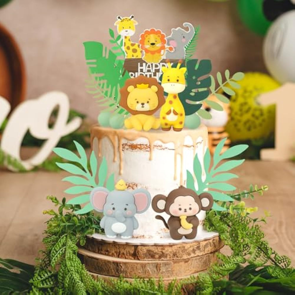 | Package Included:Forest Animals Diorama Cake Toppers With Four Critters, Six Ball Decorations, Six Plant Leaves, One Happy Birthday Toppers,For Small To Medium Sized Cakes And Cupcakes. | | Reliable Quality: This Set Of Forest Wildlife Cake Decorations Is Made Of Plastic, Foam, Paper, Bamboo Sticks And Other Materials, Which Is Not Easy To Fade. After Use, It Can Be Wiped Clean And Kept As A Souvenir. | | Product Design:Jungle Animal Cupcake Toppers Have Four Shapes: Lion, Elephant, Monkey, Giraffe, Different Shapes Of Paper Green Leaves, Overall Green Color, Bright Color, Cartoon Style Is Exquisite And Lovely, Add Nature Atmosphere To Your Forest Theme Party. | | Easy To Use: Safari Animal Cake Toppers Are Easy And Quick To Use, Let You Decorate Your Party Cakes And Cupcakes With Ease, Clean Them Up And Use These Decorations For Diy Cakes And Crafts. | | Wide Application: Our Animal Party Supplies Are Suitable For Birthday Parties, Forest Themed Parties, Zoo Themed Parties, Baby Shower, Weddings And Many Other Occasions, And Can Also Be Used As Gifts For Forest Animal Lovers. | |