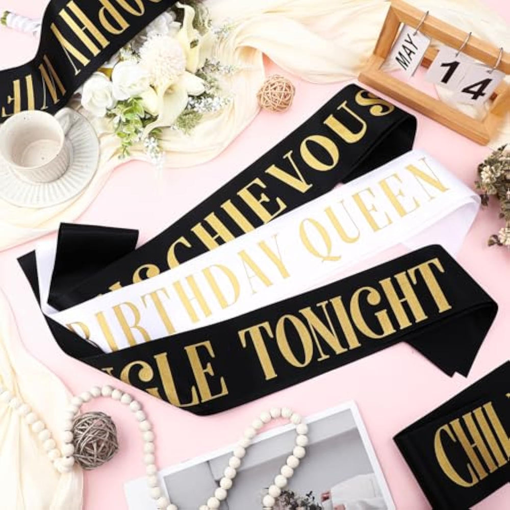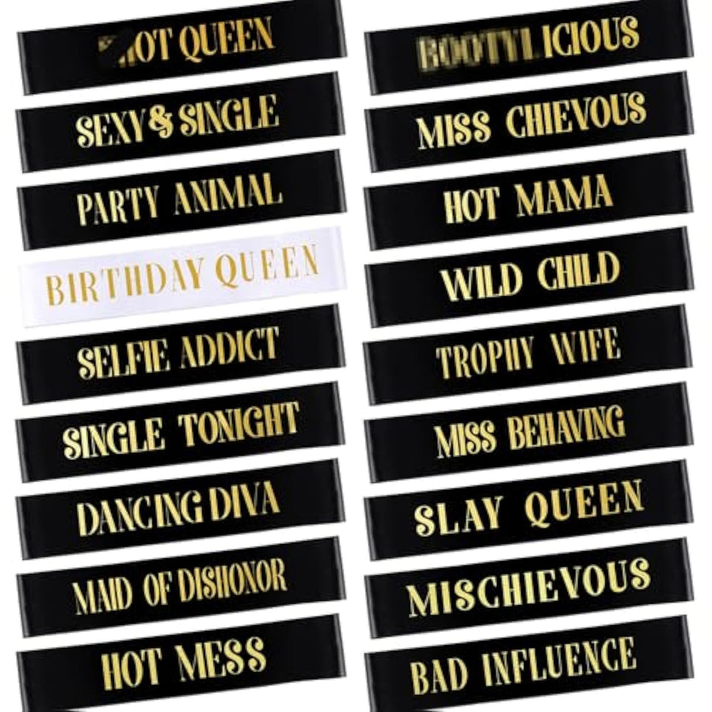 | Ample To Use And Share: You Will Receive 18 Birthday Party Sashes For Groups, Including One With White Background And 17 With Black Background, All Of Which Have Gold Characters On Them, And The Quantity Is Enough For You To Wear On Your Birthday | | Proper Size To Wear: Each Birthday Squad Sash Is About 66.93 X 3.7 Inches/ 170 X 9.4 Cm, Proper Size Allows You To Easily Wear It On Your Body, And You Won'T Feel Bound, Which Brings You A Nice Experience, There Are No Pins, No Pin Connection Required | | Comfortable To Wear: These Birthday Sash Set Are Mainly Made Of Fabrics; Silky Hand Feel, Soft Texture, Reusable, Lightweight, And Easy To Carry | | Distinctive Gifts: This Sash Is A Have For Any Birthday Girl, You Can Give These Birthday Sashes For Group To Your Friends, When The Birthday Party Is Over, This Sash Can Also Be Regarded As A Meaningful Souvenir For Your Friends | | A Variety Of Applications: This Birthday Sash For Women Is Not Only Suitable For Most Birthday Celebrations But Also Appropriate For Parties, Dances Or Other Occasions Where Sashes Are Needed | |