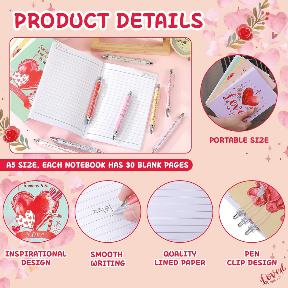 | Valentine'S Day Christian Gifts: You Will Receive 9 Jesus Valentine'S Day Notebooks And 9 Ballpoint Pens With Bible Verse Quotes, Perfect As A Bible Gift For Family Or Friends, Or A Sunday School Gift For Teenagers | | Notebook Size: The Size Of This Valentine'S Day Christian Notebook Diary Is About 5.5 X 8.3 Inches/ 14 X 21 Cm, Each Notebook Has 30 Blank Pages For You To Record, Whether It Is Work Or Study, And It Is Very Convenient To Carry When Going Out, And It Does Not Take Up Space | | Reliable Material: These Valentines Christian Notepads Are Made Of Paper, Printed With Beautiful Patterns And Inspirational Words On The Cover, Suitable For Notes, Prayers, Or Sermon Reflections, While Smooth-Writing Pens Provide A Comfortable Writing Experience; Ideal For Bible Study, Church Meetings, Or Daily Journaling | | Valentine'S Day Christian Theme Design: Our Inspirational Valentines Bible Notebook And Pen Set Are Printed With Bible Verses In Bulk; The Heart-Shaped Design With Bright Colors Adds A Festive Atmosphere; Suitable For Expressing Your Congratulations And Gratitude | | Meaningful Gift Choice: These Christian Notebooks With Pens Are Thoughtful And Faith-Centered Gift Set For Valentine'S Day, Anniversaries, Church Members, Sunday School Teachers, Pastors, Or Friends; Perfect For Sharing Love And Blessings With Those Who Appreciate Christian Values | |