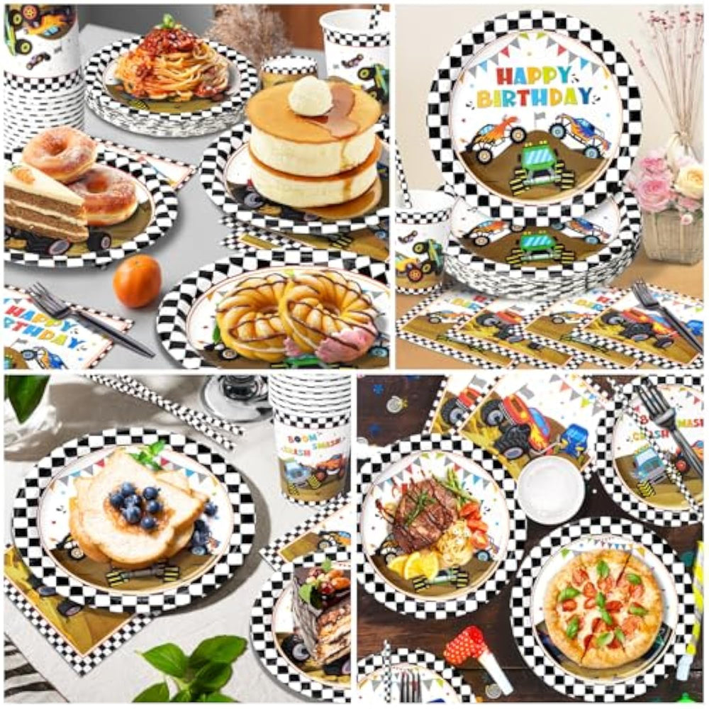 | ??Complete Monster Truck Party Supplies: The Monster Truck Disposable Dinnerware Comes With 1 Hanging Banner + 6 Hanging Cards + 6 Ornaments (2 Red/2 Gold/2 Black) + 26 Plates (13X 7" 13X 9" With 2 Designs) + 26 Cups (2 Designs) + 26 Napkins + 26 Black Forks/Knives + 2 Checkered Tablecloths (137X274Cm) + 18 Balloons (6 Orange/6 Blue/6 Red) With Coils Glue Dots. Perfect For 24 Guests! | | ??High Qualityreliable Material: Our Monster Truck Birthday Decorations Are Made Of High Quality Food-Grade Paper And Are Printed With Water-Based Ink, Which Is Safe And Reliable To