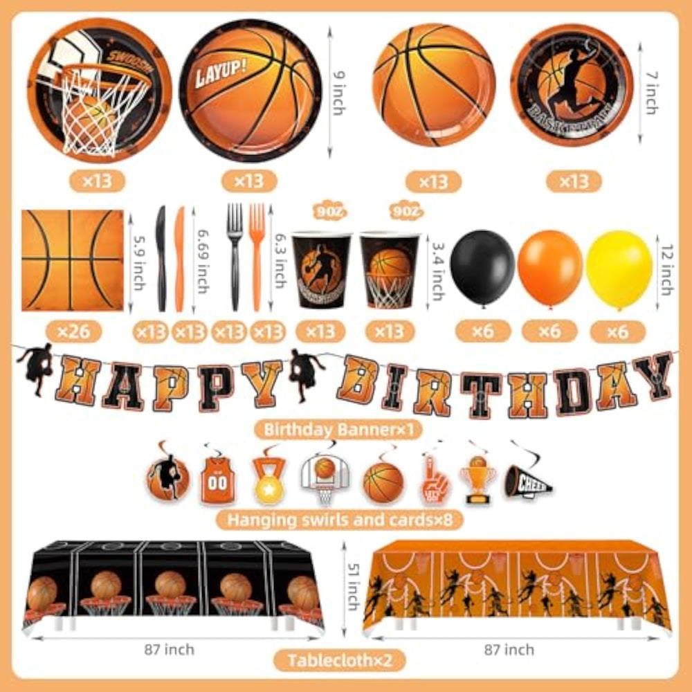 | ? 185-Piece Complete Basketball Party Kit: Transform Any Space Instantly! Includes 1 Banner, 8 Hanging Swirls, 26X7-Inch Dinner Plates (2 Designs), 26X9-Inch Dessert Plates (2 Designs), 26 Cups (2 Designs), 26 Napkins, 26 Utensils (13 Orange/13 Black Knives Forks), 18 Balloons (6 Orange/6 Black/6 Yellow), Plus 2 Durable Tablecloths (87X51 Inch, Orange Black). Outshines Competitors With More Plates, Dual-Color Utensils Tablecloths. | | ?? Pro-Game Vibe With Dynamic Design: Immerse Guests In Pro-Basketball Energy! Features Vibrant Basketball Prints, Hoop Motifs, And Bold Team Colors (Black/Orange/Yellow). Dual-Color Tablecloths Utensils Create Coordinated Courtside Aesthetics – A Unique Advantage Over Single-Color Sets. | | ?? Premium Child-Safe Materials: Food-Grade Plates/Cups Made Of Thick, Leak-Proof Paper; Non-Toxic Ink Printing. Latex Balloons Resist Bursting. | | ? Stress-Free Cleanup, More Fun Time: Disposable Yet Sturdy! Spills Simply Toss – No Washing. Bonus Hack: Bundle Trash In Tablecloths For 1-Minute Cleanup. Save 2+ Hours Vs Dishwashing – Focus On Celebrating! | | ?? Multi-Occasion Party Starter: Perfect For Birthdays, Basketball Tournaments, Team Parties, Or Sports-Themed Events. Includes Orange Coils Glue Dots For Hassle-Free Hanging. Your All-In-One Solution To Wow 26 Guests Instantly! | |