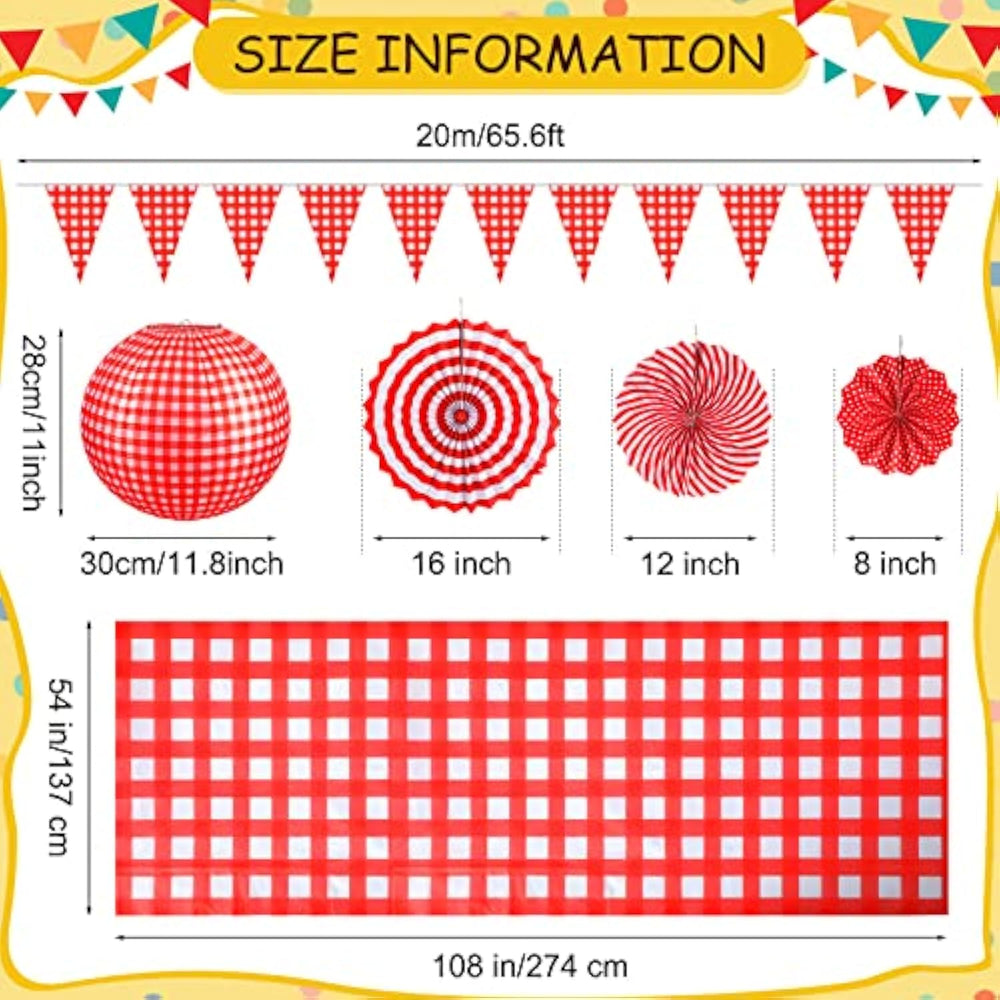This picnic party decoration set includes 4 red and white checkered disposable tablecloths, 2 matching pennant banners, 6 hanging paper fans, and 6 round paper lanterns—perfect for creating a festive, cheerful atmosphere. The tablecloths measure 108" x 54", the banners span 65.6 feet, the lanterns are 12" in diameter, and the fans come in 8", 12", and 16" sizes. Made from quality PE, paper, and metal materials, these decorations are waterproof, reusable, and easy to assemble. Ideal for BBQs, picnics, birthdays, showers, school events, and more, they add charm to any celebration.