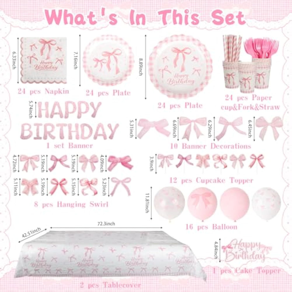 | Complete Birthday Decorations:The Coquette Birthday Decorations Kit Includes Everything You Need For A Fabulous Celebration,Includes 1Piece Banner,2Piece Tablecloth,8Pcs Hanging Swirls,1Pcs Large Cake Topper, 12Pcs Small Cupcake Toppers,16Pcs Balloons,24Pcs 9"Plates,24Pcs 7"Plates,24Pcs 9Oz Cups,24Pcs Straws,24Pcs Forks And 24Pcs Napkins, It Serves Up To 24 Guests And Is Perfect For Your Birthday Party Decorating Needs! | | Material:Our Pink Bow Birthday Decorations Are Made From Safe And Durable Materials. The Pink Bow Plates And Cups Can Hold Food And Drinks With Ease, Allowing You To Focus On Creating Memorable Moments Without Worrying About The Quality Of Your Party Supplies. | | Effortless Cleanup:Pink Bow Birthday Party Supplies Plates And Napkins Are Disposable,You Can Simply Throw Them Away When Cleaning After The Party,Which Can Reduce Your Cleanup Time,You Can Spend More Time With Friends And Families. | | Charming Bow Design:Featuring Delightful Bows And Ribbons, Our Coquette Birthday Decorations Are Designed To Captivate Guests Of All Ages. The Charming Designs Printed On Our Pink Plates, Napkins, And Cups Will Create A Joyful Atmosphere For Any Birthday Celebration Or Special Occasion. | | Versatile Party Supplies:Perfect For A Variety Of Occasions, These Pink Bow Birthday Decorations Are Suitable For Girls’ Parties, Baby Showers, Weddings, And More. Whether It’S A Bow-Themed Party Or A Girl’S Birthday Celebration, Our Bow Decor Will Help You Create Warm, Happy Memories For Your Loved Ones. | |