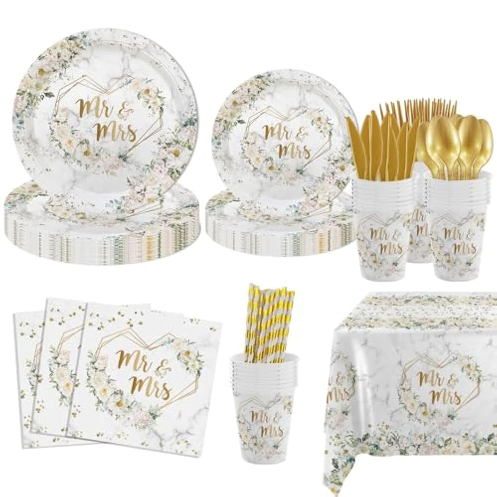 | Serve 24 Guests: Our Gold Wedding Disposable Tableware Set Severs For 24 Guests, Including 24Pcs 7'' Dessert Plates, 24Pcs 9'' Dinner Paper Plates, 24Pcs Paper Cups, 24Pcs Paper Napkins, 24Pcs Plastic Forks, 24Pcs Plastic Knives, 24Pcs Plastic Spoons, 24Pcs Straws And 1Pcs 9X4.5Ft Tablecloths. Add Elegance And Glamour To The Party | | High-Quality Material: Our Mr And Mrs Disposable Plates,Cups And Napkins Are Made Of Quality Paper, Safe, Lightweight And Easy To Grip.Disposable Knives,Spoons And Forks Are Made Of Quality Plastic,Also Odorless, And Safe For Food | | Exquisite Design: Our Gold Wedding Disposable Tableware Set Choose The Gold Text "Mr And Mrs", And Patterned With Gold Flowers,Elegant And Beautiful.The Pattern Is Also Embellished With Gold Dots And Heart-Shaped Geometric Structures, Simple And Elegant, Can Match Well With Wedding Parties.This Design Make People Feel Cosy And Give The Party A Romantic Atmosphere | | Wide Applications: Our Mr And Mrs Wedding Disposable Tableware Set Provide Plates,Cups,Napkins,Tablecloths,Straws, Knives, Spoons And Forks,They Can Match Well With Your Other Wedding Party Decorations,Such As Backdrop,Banner And So On.Suitable For Proposals, Engagements, Weddings, Anniversaries, As Well As Daily Family Dining | | Easy To Clean: Our Floral Wedding Tableware Set Is Disposable, Environmentally Friendly,And Easy To Handle.You Can Just Throw Them In The Bin After The Party, Giving You More Time To Enjoy Party Time With Friends And Family And Less Time To Clean Up | |