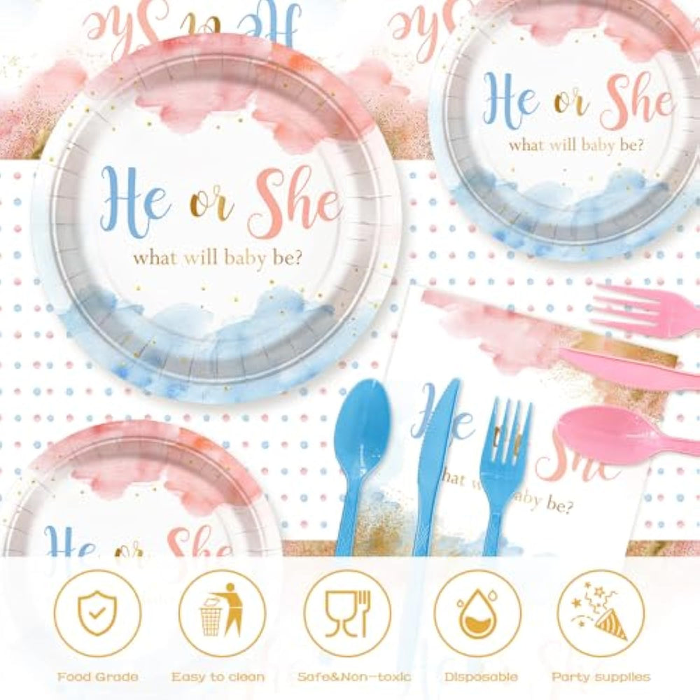 | 192 Pcs Pink And Blue Gender Reveal Party Dinnerware Set: Gender Reveal Decorations Set Includes 24Pcs 9Inch Plates, 24Pcs 7Inch Plates,24Pcs Paper Napkins,24Pcs Paper Cups,24Pcs Plastic Forks,24Pcs Knives And 24Pcs Spoons, 24Pcs Paper Straws,2Pcs Table Cover.One Set Can Serve 24 Guests | | High Quality: The Boy Or Girl Gender Reveal Decorations Supplies Tableware Set Is Bpa-Free. Pink And Blue Party Decorations Paper Plates,Cups,Napkins And Straws Are Recyclable,Heavy Duty Paper That Won'T Tear,Or Break Easily. The Knives, Forks, And Spoons Are Made Of Durable Plastic That Will Not Bend, Break | | Unique Design: Gender Reveal Decorations Supplies Are Printed With Bright And Cute Cloud Patterns, Which Will Make Your Party More Themed Atmosphere. Gender Reveal Party Design With Pink And Blue Cloud, Cutlery, Flowers, The Whole Set Is In Line With The Gender Reveal Party Decorations Theme Presents A Passionate Atmosphere That Adds A Gleeful Feel To Your Party | | Quickly And Easy Clean-Up: Use The Boy Or Girl Gender Reveal Plate Set,Clean Up Will Becomes A Very Easy Things. Designed The Convenient And Time Saving Gender Reveal Party Decorations Set Is Exactly What You Need.All Plate,Cups,Napkin,Knives,Forks And Spoons Of Our Fall Pumpkins Dinnerware Kit Are Made From Disposable Paper Or Plastic.After The Party, Throw All The Trash Directly Into The Trash Can For Quick And Easy | | Widely Applications: The He Or She Gender Reveal Tableware Set Party Supplies Are Perfect For Many Indoor And Outdoor Party,Baby Birthday Party, Gender Reveal Party,Baby Shower Party, Any Garden Yard Gender Reveal Party, Combining Pumpkin Theme Elements,Adds A Touch Of Fun And Makes Your Event Memorable For All Guests | |