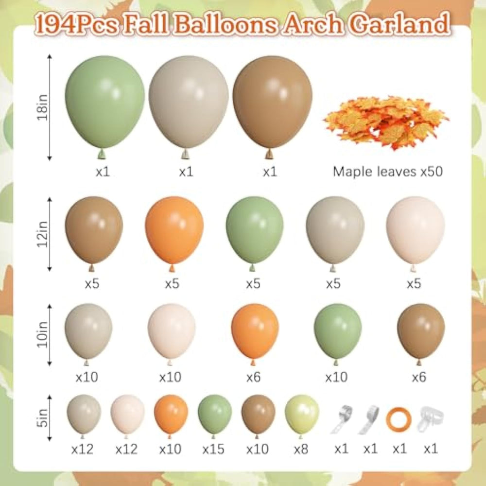 Create a stunning autumn centerpiece with our Fall Balloon Arch Kit, featuring 137 high-quality latex balloons in green, orange, sand white, nude, yellow, and brown, along with 3 festive foil balloons (maple, pine cone, and pumpkin), 50 decorative maple leaves, and essential accessories including a balloon arch strip, ribbon, tying tool, and glue points. Perfect for fall-themed events like Friendsgiving, weddings, little pumpkin baby showers, bridal showers, and birthdays, this kit transforms any space into a festive autumn setting. Assembly is simple—inflate the balloons, arrange them into clusters, attach to the arch strip or ribbon, and fill gaps with glue points for a professional-looking display. Made from premium, durable latex, the balloons are easy to inflate and packaged securely, while safety reminders ensure proper supervision for children under 12 to prevent choking hazards.