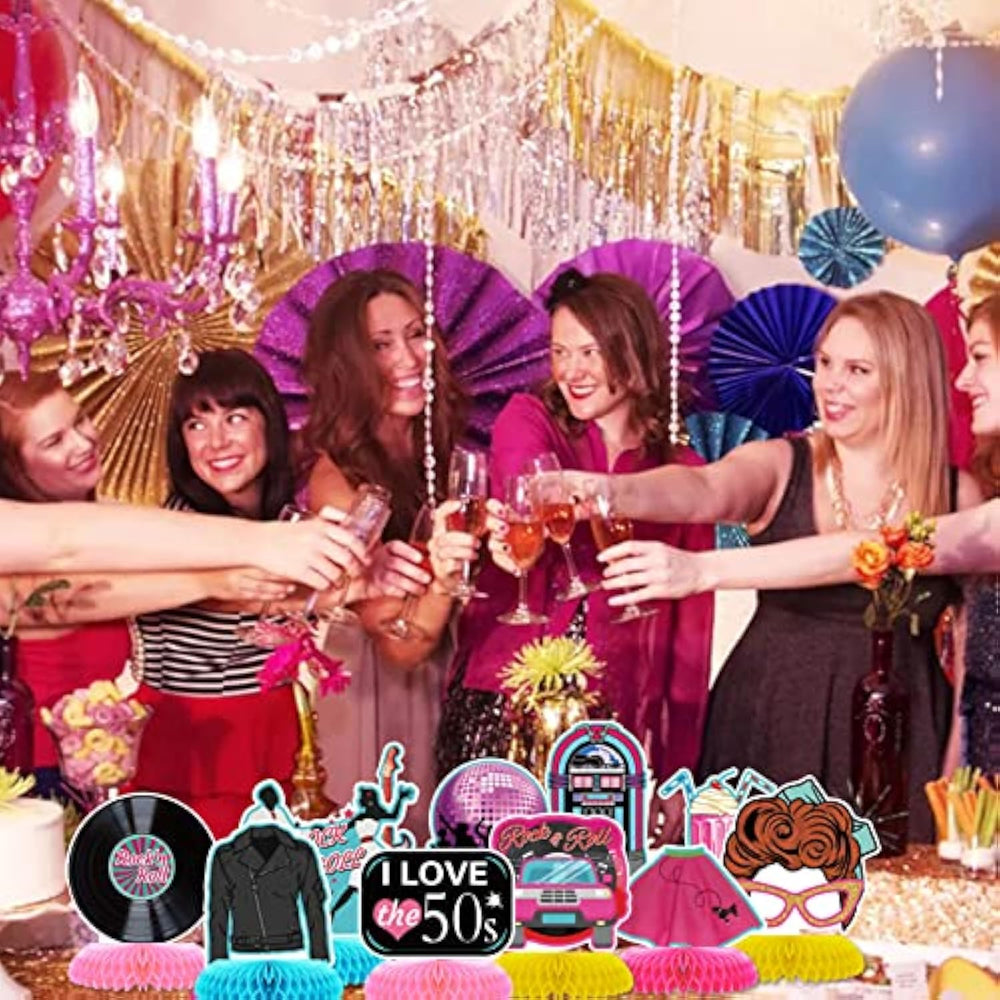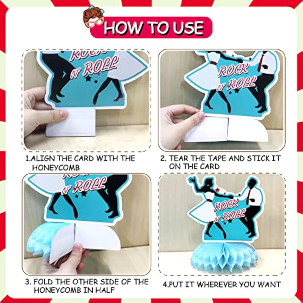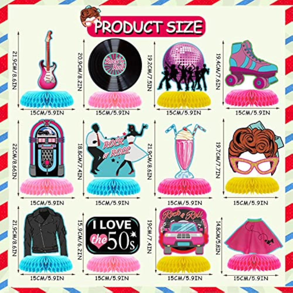 Bring retro vibes to your party with this 12-piece set of 1950s Rock & Roll Honeycomb Centerpieces. Each 6-inch tabletop decoration features fun vintage designs like jukeboxes, roller skates, guitars, records, dice, and classic "I Love the 50's" motifs. Made from durable, high-quality cardstock, they're lightweight, colorfast, and easy to assemble—just peel and stick. Perfect for 50s, 60s, or 70s themed parties, birthdays, or disco nights, these centerpieces add a fun, nostalgic touch to your table or photo setup.