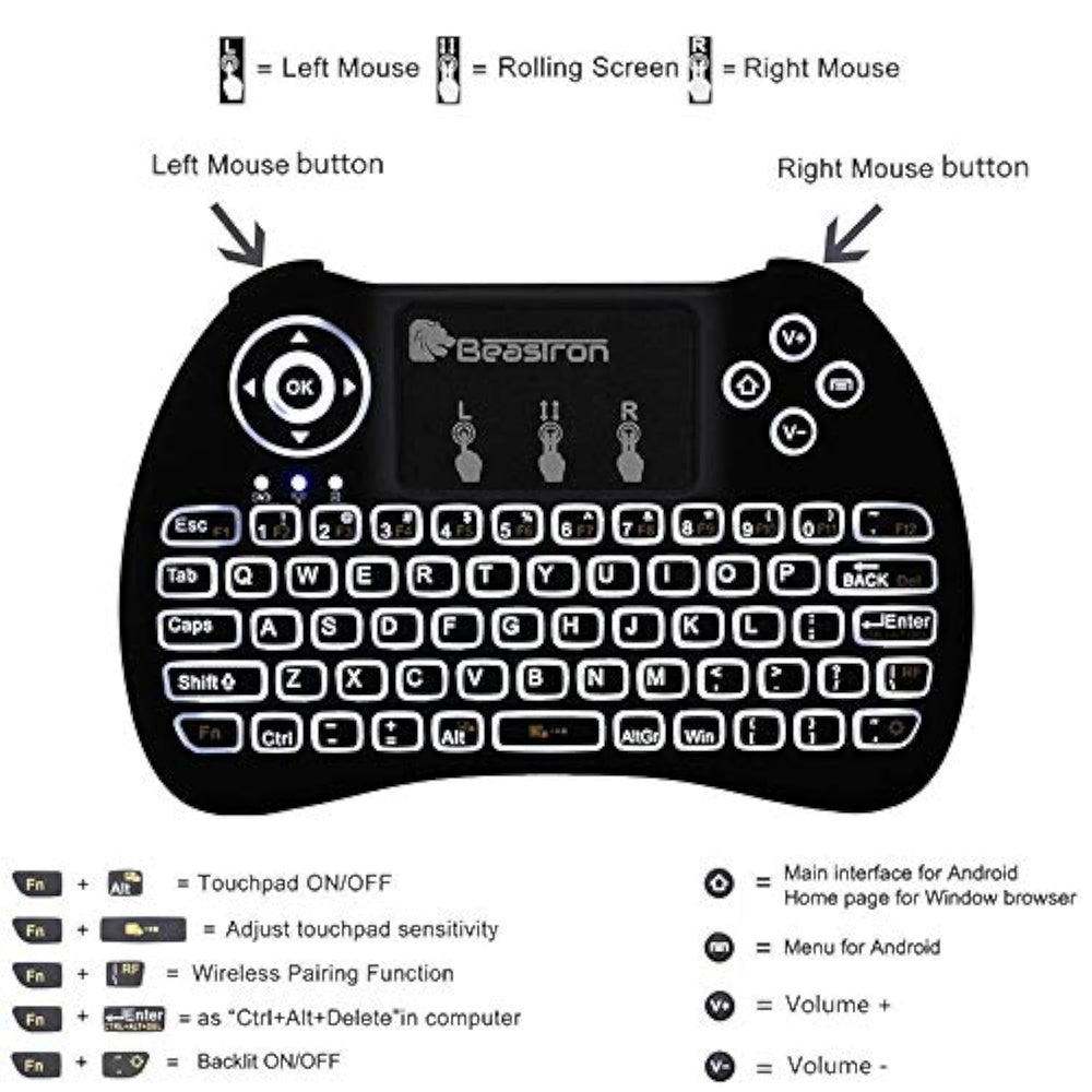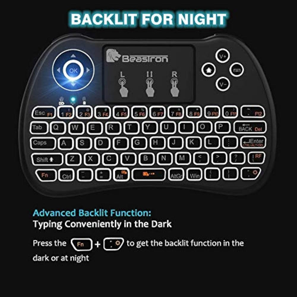 | Multifunctional: 2.4 Ghz Mini Wireless Qwerty Keyboard + Multi Remote Touchpad Mouse Combo + 2.4 Ghz Usb Receiver. All In One To Replace Streaming Media Player And Tv Remote. | | 2.4G Wireless Connection: Enjoy Long-Range (10M Max) Wireless Remote Control With The 2.4G Dongle. The Dongle Is In The Mini Keyboard Back Case. | | Power-Saving And Rgb Backlit: Press Fn+ Light Button To Get The Led Backlit Function. Easy Type In The Dark Or At Night. Environmentally Friendly Design Rechargeable Battery Mini Keyboard. | | Ergonomic Designed: Small Size Body And Light Weight Are Convenient To Carry Around Anywhere. Ergonomic Designed Allow You Easy To Grip And Hold By One Hand Or Two Hands. | | Wide Compatibility: Compatible With Pc Computer, Pad, Android Tv Box, Google Tv Box, Projector, Xbox 360, Ps3, Tablet, Notebook, Htpc, Iptv | |
