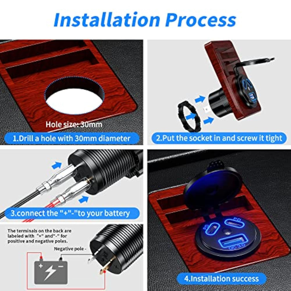 | Dual Pd Type-C Qc3.0 Usb Ports: New 12 Volt Usb Outlet Adopts With Qc 3.0 Usb And Dual Pd Type-C Charging Port Design, Which Delivery Up To 108W, Each Pd Port Power Up To 45W, Usb Port Power Up To 18W, Can Be Charge Three Compatible Devices Simultaneously, Provide Fast Charging For Devices That Support The Fast Charging Protocol, Provide The Highest Possible Charging Speed For Non-Fast Charging Devices | | Switch Blue Led: The 12V Usb Outlet Is Equipped With A Power Control Switch. Turn Off The Switch When The Usb Socket Is Not In Use, Which Can Save The Power Of The Vehicle Battery, The Blue Led Light Can Help You Check Whether The Circuit Is Connected Successfully, And Easily Find The Usb Charging Port In The Dark Environment | | Ip66 Waterproof: Internal Circuit Adopts A Completely Enclosed Design, Usb Port Equipped Splash Cover For Waterproof And Dust-Proof, This Waterproof Usb Socket Can Work Well For Boat Marine. | | Fire-Retardant Materials: The Boat Accessories Usb Car Charger Made Of Environment-Friendly Abs Material, High Temperature Resistant, Low Temperature Resistant, Also Has Anti-Flame-Retardant Properties, It Can Work In An Environment Of -40° To 80° | | Wide Compatibility: Quick Charge Qc3.0 Usb Dual Pd Type-C Charger Socket Diy Kit Fit For Dc 12V - 24V Car, Boat, Marine, Golf Cart, Atv, Rv Etc. This Usb Socket Is Suitable For Charging Cellphones, Tablets, Power Banks, Video Games Controllers, Sports Watch And Other Digital Equipment | |