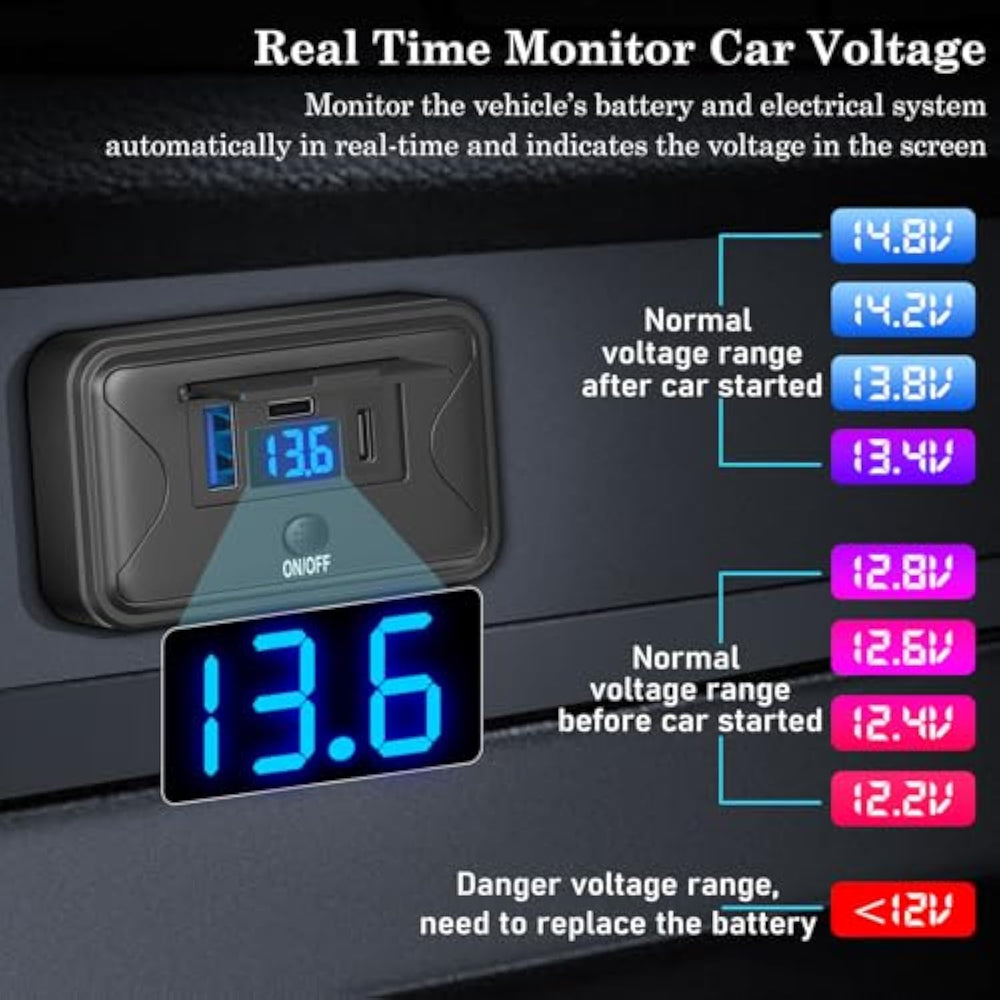 | Cost Effective: 2-Pack Provides A Spare Portable Usb Outlet To Keep In Your Travel Bag Or A Second Vehicle. Spend Less Money For A Better Shopping Experience. | | No Need To Drill A Big Hole: Surface Mounting, Can Be Installed On A Flat Surface, No Need To Open A Big Hole, Just Open A Small Hole, Put The Wire In, The Black Wire Connects To The Negative Pole, The Red Wire Connects To The Positive Pole, Tighten The Screws And Cover The Lid. | | Charge 3 Devices At The Same Time: This 12V Usb Panel Outlet Is Upgraded With 3 Ports And Equipped With A Smart Chip. It Can Charge 3 Devices At The Same Time Without Interfering With Each Other, The Pd Port Has A Maximum Output Of 36W, And The Qc Port Has A Maximum Output Of 18W. | | Dual Pd Usb C Port: Adopting The Latest Power Delivery Fast Charging Port, The Output Power Is Up To 36 Watts, Suitable For Charging Laptops, Lpad Pro, Lphone 15/14/13/12/11 Mini/Pro/Max, Samsung Galaxys22, S21, S20 S10 And Other Devices, To Meet Your Charging Needs. Charging Needs. | | Blue Digital Display: The Digital Voltmeter Monitors The Battery And Electrical System Automati