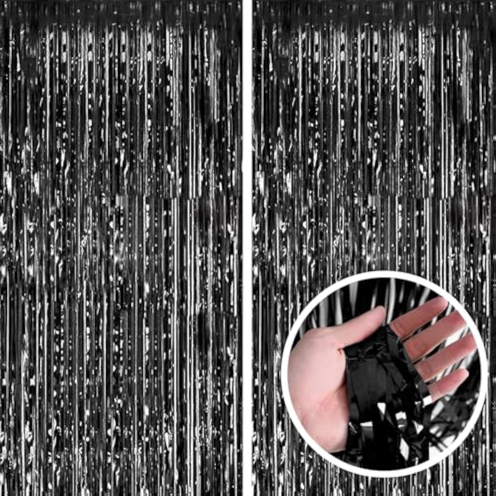 This set includes 2 packs of black tinsel foil fringe curtains, each measuring 3.2ft x 8.2ft, perfect for creating a shiny and eye-catching backdrop for parties, events, and photo booths. Made of non-toxic, odorless, and durable tinsel material, these curtains add sparkle and elegance to occasions such as birthdays, weddings, graduations, baby showers, proms, theme parties, Halloween, Christmas, and New Year celebrations. Each curtain comes with adhesive backing for easy installation on walls, doors, tables, or frames, and can be trimmed or layered to achieve the desired look and coverage, making them a versatile choice for party décor.