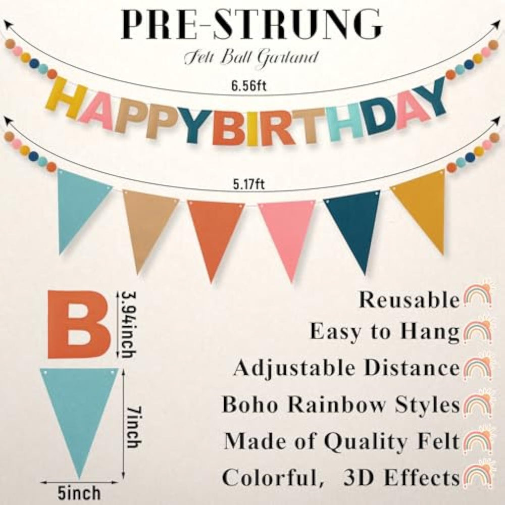 | What'S Included: Brighten Your Party With Our Happy Birthday Banner Set; This Set Includes A 6.52Ft Felt Happy Birthday Banner With Felt Wool Balls On Both Ends, And A 5.17Ft Colorful Felt Triangle Flags Bunting That Perfectly Matches Your Boho Birthday Decorations; Each Letter Measures 3.94 Inches Tall, Neither Too Small To Read Nor Too Large To Hang | | Quality: The Letters Are Made From Soft Felt For A Smoother Touch And Are Wrinkle Resistant; The Side Balls Are Wool Felt, Not Ordinary Pom Poms; The Vibrant Colors Fit All Kinds Of Birthday Party Decoration Themes; You Can Adjust The Spacing Freely, Hang The Birthday Garland As One String Or Separate The Two Words | | Stunning Boho Birthday Decorations: Our Boho Felt Happy Birthday Sign Features Filled And Stitched Craftsmanship, Creating A 3D Effect That Adds A Stunning Backdrop To Your Celebration; The Letters Are Carefully Cut And Sewn From Felt, Making This Felt Happy Birthday Banner Reusable For Future Happy Birthday Decorations, And Durable For Long Term Use Without Damage | | Easy To Install And Use: Pre-Strung, No Need To Worry About The Order; When Our Colorful Happy Birthday Party Banner Reaches You, Each Letter Is Already Threaded On Red And White Twine; The Letters And Felt Balls Can Be Easily Moved To Leave Space Between Them; Just Open And Hang; This Complete Party Decoration Set Can Meet All Your Party Needs At Once; The Happy Birthday Garland Is A Good Decoration For Your Boy'S, Girl'S, Or Your Own Birthday Party; Hang Them Up Now | | Wide Application: Versatile And Full Of Charm, This Boho Birthday Felt Banner Set Blends Effortlessly With Different Styles And Occasions, Like Mantels, Railings, Windows, Dessert Tables, Or Even As A Photo Background, Our Banner Infuses An Energetic And Vibrant Atmosphere; Whether It'S For Your Boy Or Girl'S Birthday Or A Celebration With Friends And Family, No Matter The Age, These Colorful Birthday Decorations Bring Joy And Festivity To Your Special Day | |