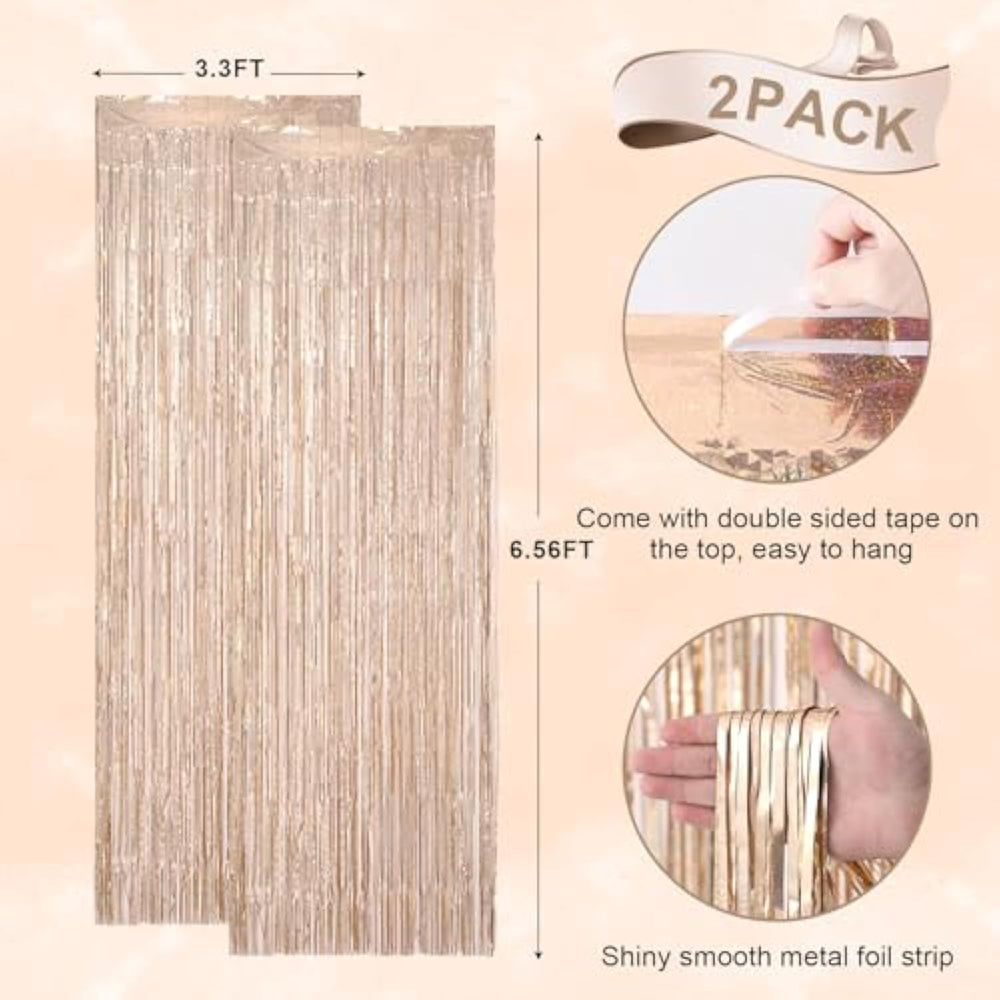 | 100% Pet | | Stunning Decorative Set: You'Ll Receive 2 Pcs Champagne Gold Foil Fringe Backdrop Curtains, Each Measuring 3.28 Ft (Wide)×6.56 Ft (Drop). Enough Length Foil Fringe Curtains Backdrops Are Perfect For The Door Or Wall To Create An Impressive Decoration | | Premium Quality: Crafted From Shiny Pet Tinsel, These Light Gold Fringe Curtains Are Designed To Be Light Weight, Easy To Hang, And Resistant To Wear And Tear. The Metallic Party Streamers Reflect Light Beautifully, Creating A Mesmerizing Visual Effect | | Versatile And Reusable: Making The Laser Gold Foil Curtains Ideal For Princess, Gender Reveal, New Year, Anniversary, Valentine'S Day, Mother'S Day, Disco, Engagement, Bridal Etc. You Can Easily Store And Reuse Them For Future Celebrations | | Eye-Catching Design: These Gold Foil Fringe Tinsel Backdrops Boast Vibrant Colors And A Shimmering Effect That Reflects Light Beautifully. Your Friends Will Be Mesmerized By The Captivating Atmosphere These Curtains Create | | How To Set Up: Wipe Down Wall/Table/Door, Ensure Surfaces Are Clean And Dry, Tear Off The Double-Sided Adhesive Tape, Paste The Foil Backdrop Curtains And Press. Hang Each Individual Tinsel Fringe Curtains In Different Locations For A Fuller Effect | |