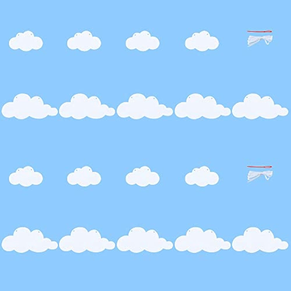 | Package Included: 2 Pack X Cloud Garland. ( 10 Large White Clouds, 8 Small White Clouds, 2 Perforated Plastic Needles, 2 White Ropes.) | | Product Size: White Cloud Size Approx. 7.48 X 3.34 Inch (19 X 8.5 Cm), 4.48 X 2.75 Inch (11.4 X 7 Cm). White Ropes Size Approx 9.8 Ft/300 Cm Long. | | Product Material: Made Of Thick Felt, Will Last Much Longer Than Paper Garland, And Won'T Crinkle Or Rip. | | Cloud Decorations Product Description: You Only Have To Use Thread Through The Needle And Then Through The Holes, Just A Little Diy, Very Easy. Can Help You Save Time And Energy In Organizing Your Awesome Party. | | Cloud Baby Shower Extensive Use: Perfect For Weddings, Baby Shower, Living Room Decor, Bridal Shower, Festival, Photo Props, Background Decor, Etc. | |