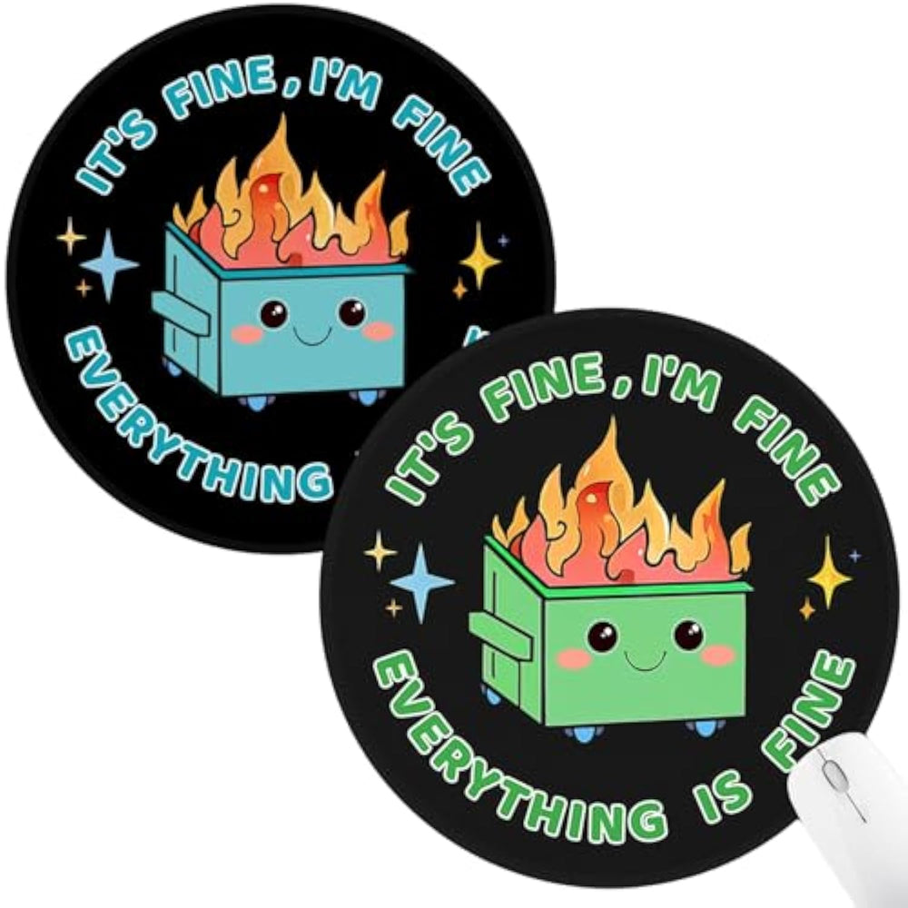 | Awesome Mouse Pad Design - This Mouse Pad Features A Cute Funny Dumpster On Fire Pattern Design: It'S Fine I'M Fine Everything Is Fine, Which Will Bring You More Happiness While Working, Studying Or Playing. The Small Mouse Mat Also Fits All Types Of Desktop, Keyboard, Laptop And Wireless Computer Mouse. | | Perfect Size Mousepad - The Round Mousepad Is Designed For Convenience And Has An Ideal Size That Fits Perfectly On Any Desk Or Workspace, Measuring 8.6×8.6×0.12 Inches (220Mm X 220Mm X 3Mm). It Is Lightweight And Easy To Carry, Making It For Use At Home, In The Office, While Gaming, Or While Travelling. | | Super-Smooth Surface - The Surface Of Mousepad Is Made Of High-Quality Lycra Cloth, Ensuring Smoother Mouse Control And Pinpoint Accuracy. Optimised For Mouse Sensor, Designed For Maximum Control And Precision. | | High Quality Material - The Mouse Pad Is Made Of High-Quality Materials, Which Can Ensure Durability And Long-Lasting Use. It Is Suitable For All Kinds Of Mouse, Laser And Optical. | | Amazing Gifts - This Design Of The Mouse Pads Is Personalized, The Color Of The Mousepad Is As Vivid As The Pictures, Which Is For Valentine'S Day, Mother'S Day, Father'S Day, Holiday And Birthday. It Is Also A Great Desk Accessory For Co-Worker, Friends, Teammates, Employees, Students, Staff. | |