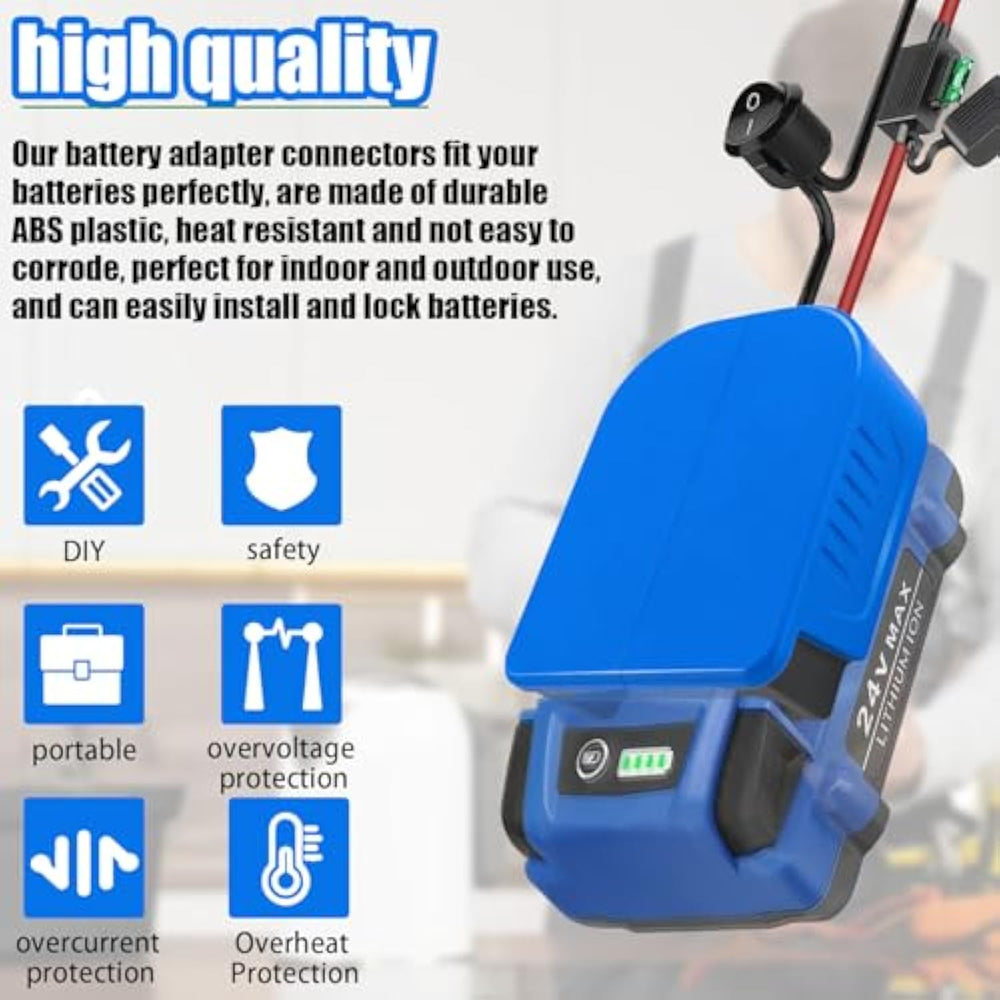 ?Perfectly Works With Kobalt 24V Battery?Compatible With Kobalt 24V Max Kb624-03 Kb524-03 Kb424-03 Kb224-03 Kb124-03 Li-Ion Batteries. | | ?Equipped With 30Amp Fuse?Added Switch Ensures You Can Turn Onoff The Battery Easily, Equipped 30Amp Fuse Protect Battery Devices From Overpower Damage, Waterproof Fuse Holder Rubber Cap Fits On Tightly To Protect Blade Fuse Inside. High Quality Silicone Copper Wire Improves The Conductivity And Safety, Heat-Resistance 14 Awg Wire Is Suitable For High-Power Applications. | | ?Easy To Use?Only Need To Move The Power Adapter Into The Groove, Then Push Converter And Make Sure It Has Locked The Battery. If You Want To Remove The Adaptor From The Battery, Please Press Down The Buckle Of The Battery, Then Remove It. | | ?Safe Durable?Our Battery Adapter Made Of High-Quality Abs Material, It'S Durable And Lightweight. You Can Use It For Your Power Wheels, Rc Toys, Robotics, Or Other Diy Projects That Work With A Maximum 30A Current. Pe.