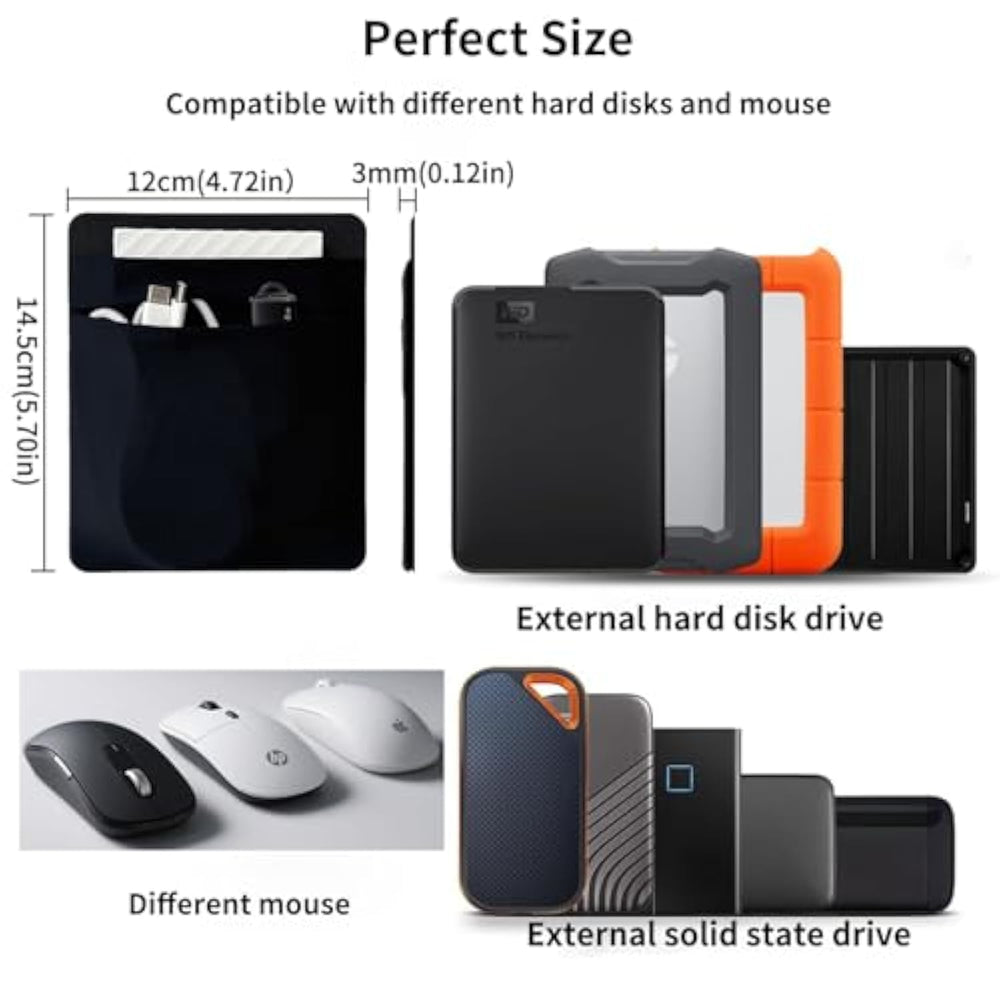 | On The Go: Tired Of Juggling Essentials During Meetings Or Travel This Stick-On Mini Organizer Keeps Everything Secure And Within Reach. No More Lost Drives. Ideal For Tech-Savvy Travelers | | Double Pocket Design: Features A Built-In Safety Strap And Extra Storage Pouch To Keep Your Valuables Organized And Safe. Perfect For Electronic Accessories And Smaller Personal Items | | Universal Fit: Compatible With Portable Ssds Such As Sandisk Extreme/ Extreme Pro, Samsung T5/T7, Crucial X8, Apple Magic Mouse, Airpods, Airtag, Smarttag, Ledger Nano, Usb Cables, Earbuds, Small Battery Packs, Cards, And More | | Reusable 3M Adhesive: Equipped With High-Quality 3M Tape, It Sticks Securely To Hard, Clean Surfaces Like Macbook Laptops, Ipads, And Notebooks. Detach And Reattach Without Residue | | Durable Sleek: Made From Synthetic Fiber With Exceptional Elasticity And A 2Mm Thick Backing, This Pouch Is More Durable And High-Quality Than Others On The Market. Tested By Professionals | |