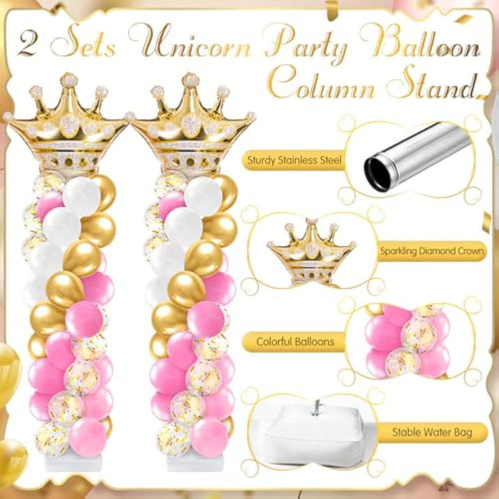 This princess balloon column kit includes 2 adjustable stands, 2 crown foil balloons, and 100 latex balloons in pink, white, hot pink, gold, and sequin styles. Also included are balloon clips, knotters, glue, water bags, a manual pump, and assembly accessories for easy setup. Made from durable latex, aluminum film, and sturdy stainless steel, the materials are safe, reusable, and weather-resistant. Easy to assemble, the columns reach up to 106 inches tall, creating an eye-catching and elegant princess-themed display perfect for birthdays, baby showers, or special celebrations.