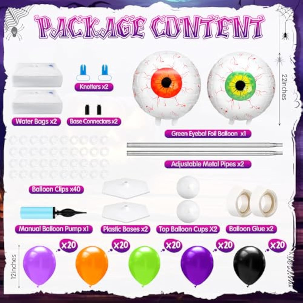 This Halloween party balloon stand kit comes with everything you need to create a spooky and festive atmosphere. Each package includes 2 sets with 2 eyeball foil balloons, 100 latex balloons in assorted colors (pink, white, purple, aqua blue, and sequins), 2 adjustable metal pipes, 2 sturdy plastic bases, 2 base connectors, a manual balloon pump, 2 balloon knotters, 40 balloon clips, 2 balloon cups, 2 water bags, and 2 balloon glue. Made from safe latex and aluminum film, the balloons are durable and not easily breakable, while the telescoping poles are crafted from thick stainless steel for strength, reusability, and outdoor resistance. Simple to assemble, just connect the pole to the base with the connector, secure it with the water-filled bag, and attach your balloons using the clips and cups. Once built, the balloon column stands reach about 106.3 inches (270 cm) tall, with eyeball foil balloons at the top to add a fun and spooky touch to your party. Perfect for Halloween, these balloon arch columns also work beautifully for birthdays, weddings, baby showers, bridal showers, engagements, or as photo backdrops, adding charm and festive spirit to any occasion.