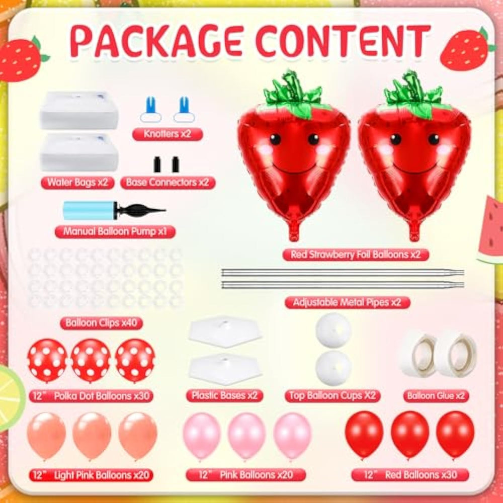 | Ideal Combination: You Will Receive 2 Sets Of Strawberry Balloon Column Kits, Included 2 Red Strawberry Foil Balloons, 100 Pieces Of 12 Inches Latex Balloons In 4 Colors, 2 Adjustable Metal Pipes, 2 Plastic Bases, 2 Base Connectors, 1 Manual Balloon Pump, 2 Balloon Knotters, 40 Balloon Clips, 2 Balloon Cups, 2 Water Bags And 2 Balloon Glue | | Reliable Material: The Balloons In Our Strawberry Balloon Column Stand Sets Are Made Of Latex And Aluminum Film, Which Are Safe, And Not Easy To Break; The Balloon Tower Stand Kit Is Made Of Plastic, And The Telescoping Pole Is Made Of Thick Stainless Steel, Strong And Sturdy, Reusable And Corrosion Resistant For Outdoor Use | | Cute Strawberry Balloon Tower Stand Kit With Base: After Assembly, The Total Height Of The Strawberry Balloon Arch Column Decorations Reaches About 106.3 Inches/ 270 Cm; These Strawberry Foil Balloons Measure About 27.95 X 18.9 Inches/ 71 X 48 Cm After Inflating, With A Strawberry Design, And The Colorful Strawberry Balloon Decorations Add More Elegance And Style, Making You Party Full Of Sweet Atmosphere | | Quick To Assemble: It Is A Breeze For You To Assemble; Connect The Balloon Telescoping Pole To The Base With Connector, Fill The Water Bag With Water And Place It On The Base To Fix The Balloon Holder; Connect The Blown Balloon To The Balloon Clips, And Assemble Colorful Balloons; Tie The Protagonist Strawberry Aluminum Film Balloon To The Balloon Cup And Put It On The Top Of Balloon Stand, And Our Beautiful Strawberry Balloon Arch Kit Stand Ornaments Are Completed | | Widely Applied: Our Strawberry Balloon Pillar Stands Are Suitable For Most Sweet Occasions, Such As Fruit Theme Parties, 1St Birthday Parties, Baby Showers, Strawberry Parties, Family Parties, Engagements Bridal Showers, Weddings And More Joyful Occasions; They Can Also Be Party Backdrops Or Photo Props, Making Them An Addition To Your Celebration Party, Bringing You A Lot Of Fun | |