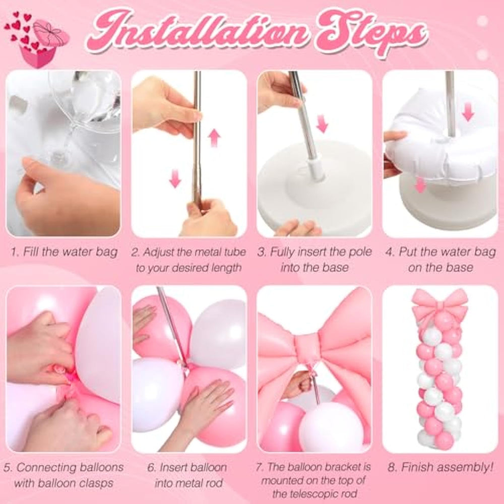 | Pink Bow Balloon Column Stand Kit: 2 X Pink Bow Balloon ( 30 X 25 In) , 50 × Light Pink 10 Inch Latex Balloons, 50 × White 10 Inch Latex Balloons, 2 × Stainless Steel Telescopic Poles, 30 × Balloon Clips, 2 × Bases, 2 × Water Bag Bases, 2 × Base Adapters, 1 Roll Of Glue Point, 1 Roll Of Ribbon, 2 × Balloon Holder, Ideal For Pink Bow Themed Parties | | Durable Material: The Three-Dimensional, Elegant Bow Balloons On The Balloon Columns Are Composed Of Quality Latex, Which Ensures That The Balloons Are Tough To Burst; Every Balloon Has Been Meticulously Crafted And Matched To Create The Ideal Aesthetic Impact; It Can Draw Attention To The Host'S Distinctive Taste, Whether It Is Applied As The Party Venue'S Background Decor Or As The Welcome Area'S Centerpiece | | Dreamy Atmosphere: Our Bow Balloon Column Is Mainly Tied In Romantic Pink, Combining Pink, Pale Pink And White Balloons To Create A Warm And Dreamy Party Atmosphere; These Color Combinations Not Only Meet The Decoration Needs Of Princess, Sweet Or Romantic Themed Parties, But Also Make Every Guest Feel Full Of Love And Warmth | | Easy To Install: Without Complex Assembly Steps, It Can Be Easily Installed In A Few Steps, Greatly Saving Time And Effort; The Structure Of The Stainless Steel Telescopic Rod Is Stable And Not Easy To Deformation, And The Height Can Be Adjusted According To The Need (From 1.5 Feet To 6.6 Feet) To Meet The Decorative Needs Of Different Occasions; Whether It'S By The Door Or On Either Side Of The Party Floor, You Can Quickly Create A Striking Balloon Column | | Wide Applications: This Bow Balloon Column Stand Is Not Only Suitable For Princess, Sweet Or Romantic Theme Parties, But Also Widely Suitable For All Kinds Of Celebrations, Such As Birthday Parties, Weddings, Baby Full Moon Banquet, Etc. Its Distinctive Bow Design And Color Matching Can Easily Blend Into The Decorative Style Of Different Occasions, Making Your Party More Memorable | |