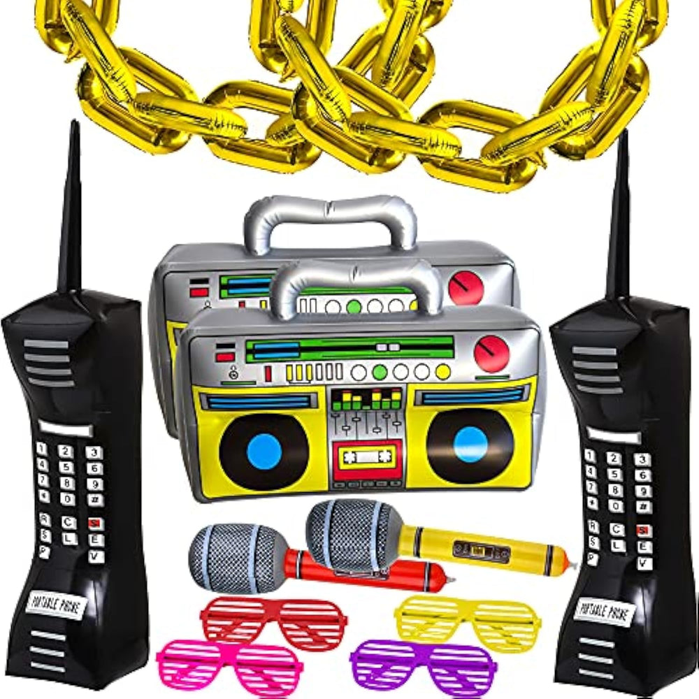 | Inflatable Party Props: Each Package Include 2 Piece Inflatable Boombox, 2 Piece Inflatable Mobile Phone, 2 Pieces Inflatable Microphone, 4 Pieces Shutter Shading Glasses And 10 Piece Gold Foil Chain Balloons, Totally 20 Pieces For A Set Of Decoration Kit Can Decorate 80S 90S Parties Or Hip Hop Theme Gatherings, Nice Combination Will Satisfy Your Decoration Needs | | Size Detail: The Boombox Measures Approx 50 X 20 X 22 Cm/ 19.68 X 7.87 X 8.66 Inches After Inflated, The Mobile Phone Measures About 76 Cm/ 29.92 Inches In Length And The Microphones Measure Approx.35 Cm/ 14 Inches In Length After Inflated, The Shutter Shading Glasses Width Approx. 14 Cm/ 5.5 Inch And The 16 Inch Gold Foil Chain Balloons, Ideal For Your 80S 90S Parties And Hip Hop Party And Fun Cosplay Or Halloween Dj Costume, Create A Joyful Atmosphere | | Quality Material: This Inflatable Boombox Set Is Made Of Pvc Material Printed With Classic Look, Well Printed And Unique, Solid Plastic Base Helps It Stay Standing And Light Weight Allows You To Easily Carry To Your Friends' Parties, Looks Like A Real Boombox, Which Makes The Themed Party More Fun, The Shutter Shading Glasses With Lightweight Frame And Chic Retro Style, Will Make You Look More Cool And Eye-Catching | | Creative Design: The Inflatable Radio Features The Image Of Buttons, Cassette Player And Various Other Things You Would Find On An Old-Style Portable Radio, The Mobile Phone Is Printed With Number Key And Antenna, Which Makes The Phone Look More Realistic, They Will Bring You Much Fun In The Party, The Foil Chain Balloon Should Be Connected Together To Form A Chain Balloon Before Inflation, They Will Be Exquisite Photo Props For You To Take Interesting Pictures | | Wide Application: The Inflatable Hip Hop Props Are Designed With Vivid Appearance And Printed With Colorful Patterns, Full Of Rock Elements, Novel And Realistic, Which Can Create Joyful Atmosphere And Large Size Makes The Scene Full Of Humor, Leaving You Unforgettable Memory, Suitble For Decorating 80S 90S Parties, Graduation Themed Party Or As Props For Elementary School Musical, Fun Cosplay Or Halloween Dj Costume | |