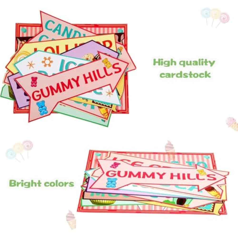 | What You Receive: You Can Get 20 Pieces Candy Land Party Signs In 10 Different Styles, Each Style Has 2 Pieces, All These Beautiful Signs Are Wonderful Decoration To Welcome Your Guests; Note: The Package Does Not Include Wooden Holder | | Reliable To Use: Our Welcome Directional Signs Are Made Of Thick Cardstock, With Single Sided Printing, Mainly In Pink And Blue Color, And The Chocolate Directional Sign Is Brown, Not Easy To Break, Ensure You To Use For A Long Time | | Size Details: The Candyland Sign Ranges From 10 X 4 Inches To 10 X 8 Inches, Because There Are Various Styles, So The Size Is Different, Proper Size For You To Decorate Candy Parties | | Various Styles: Some Of Them Are Fragmented And Some Are Arrow Shaped, Printed With Different Words, Which Can Direct The Right Way For You, And This Adorable Design Will Go Well With Your Candy Party Decorations | | Where To Use: These Candy Land Directional Signs Are Good Addition To Christmas, Sweet Shop, Classroom, Birthday Party And Candy Theme Party Decorations, These Candy Land Decorations Will Be A Huge Surprise With Your Children And Her Friends, And These Candy Land Party Signs Can Serve As Photo Props For You To Take Interesting Photos With Your Friends | |