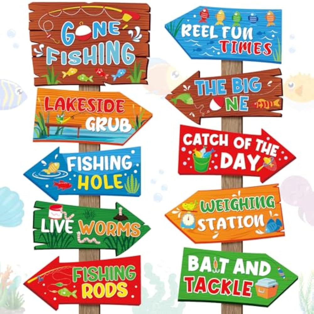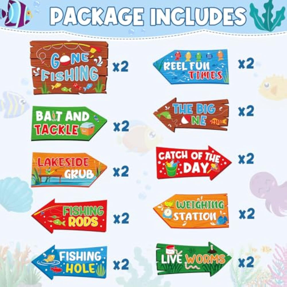 | Rich In Quantity: You Will Receive 20 Pieces Of 10 Different Gone Fishing Signs, 2 Pieces Of Each Style, Setting Up The Gone Fishing Party Decorations Will Make Your Party More Thematic; Note: Package Does Not Include The Wooden Stand! | | Easy To Use: Our Party Direction Signs Are Available In Different Sizes As Shown, Easy To Stick On Doors, Walls, Windows, Porches, Tables, Staircases, And Used As Entrance Welcome Signs, Fishing Party Decorations, Area Direction Signs, Photo Booth Props And So On | | Application: Designed With A Variety Of Fish, Float, Fishing Rod, Hook, Plumbing Net, Go Fishing Sign And Other Patterns, You Can Decorate Your Patio, Garden, Backyard, Lawn, Porch As Fishing Themed Party Decorations Or Retirement Party Decorations | | Reliable Quality: Fishing Party Signs Are Made Of Thick Card, Not Easy To Break, Printed On One Side, Designed In Irregular Shapes Or Arrowheads, Take Large Font Logo, Bright Colors, Easy To Attract Attention And Read, Clear Indication Of Party Theme And Direction | | Services: We Have Strict Product Quality Control And Inspection Before Shipment, Sent In Good Packaging, If You Are Not Satisfied With Our Products, We Will Replace Or Refund For You, Your Satisfaction Is Our Ultimate Goal | |