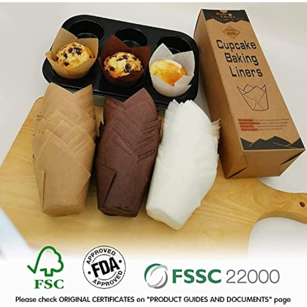 Size/Color: Package Includes 200 Unbleached Pieces Of Tulip Cupcake Liners In Total. The Bottom Diameter Of These Cupcake Cups Is 1.97 Inches (5 Cm), Fitting Standard Muffin Or Cupcake Pan. The Depth Is 2.2 Inches (5.5 Cm) At The Low Point And 3.15 Inches (8 Cm) At The High Point With A Capacity Of 3 Oz. | Reliable Material, Reliable Brand: Quality Is Our Top Priority. The Paper Of Cupcake Liners Is From Europe. The Paper Material Of Cupcake Liners Has Complied With Fda (U.S. Food And Drug Association), And Fsc(Forest Stewardship Council) Regulations. Is A Strong Advocate Of Safe And Green Food Packaging. | Easy To Use And Versatile: Tulip Cupcake Liners Are A Great Choice To Upgrade Your Cupcake. Compared With Normal Cupcake Liners, Tulip Cupcake Liners Make Cupcakes Look More Beautiful And Fresh. Not Only For Cupcakes, But It'S Also A Perfect Baking Holder For Biscuits, Tart, Cookies, And Brownies, All Your Consumers Need To Do Is Just To Unfold The Liner And Enjoy The Dessert. Let'S Prepare An Impressive Party For Your Family And Friends With Tulip Cupcake Liners! | Heat-Resistant Thicker Paper: Tulip Cupcake Liners Are Made From 50-55Gram/M2 Greaseproof Paper, Which Is 1/5 Thicker Than Normal Parchment Paper. Therefore, These Cupcake Liners Is Consistently Greaseproof And Can Handle The Temperature Up To 220°C/428°F Without The Addition Of Fluorocarbons. | Stable And Responsible Package: To Prevent Damages During , Baking Liners Come In A Convenient, Stable Kraft Paper Box. There Is A Cardboard Holder Inside The Box To Maintain A Perfect Shape For The Cups. We Will Do Our Best To Ensure Every Single