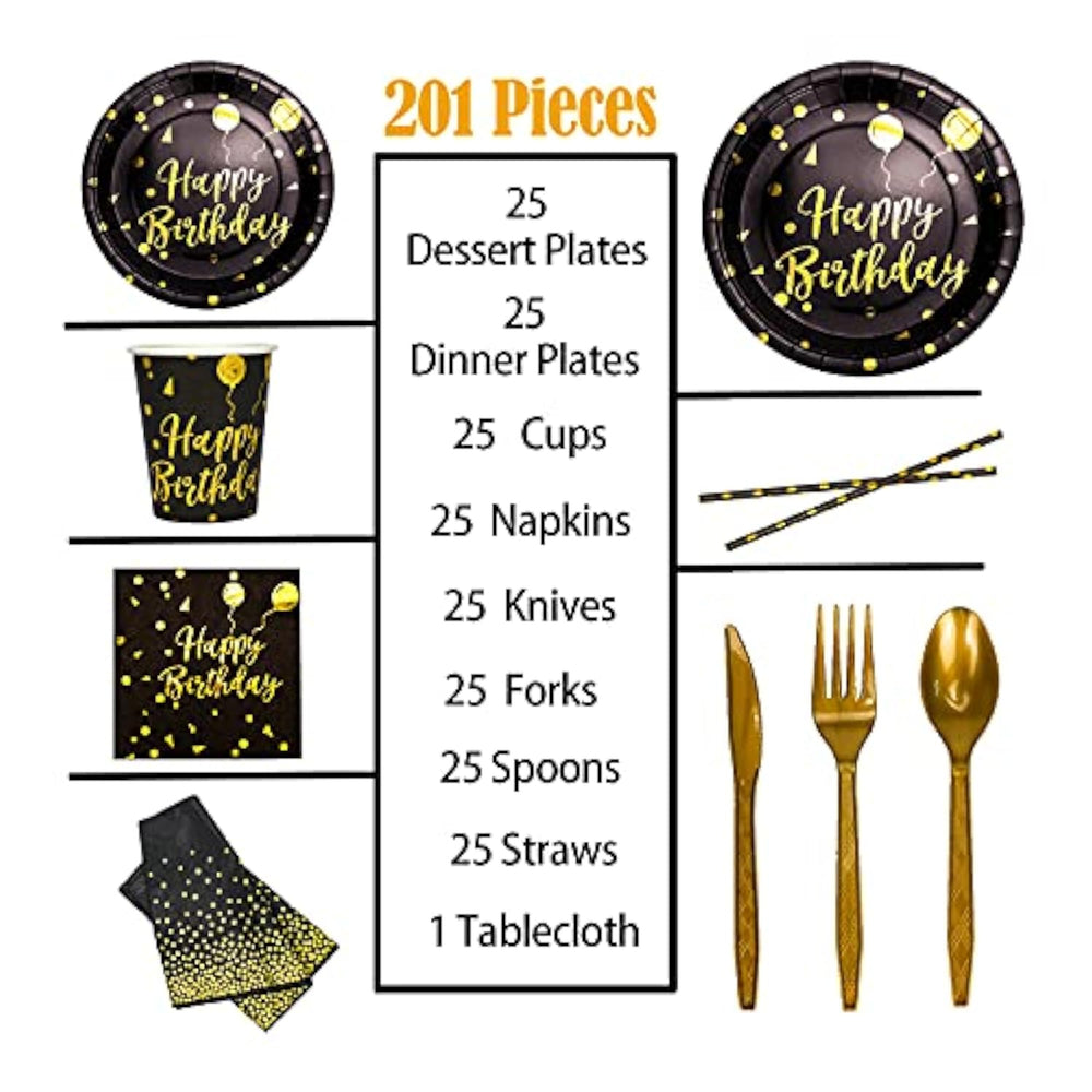 | 201 Pcs Disposable Tableware Set For Party: Each Set Contains 25 Packs Of 9-Inch Plates, 25 Packs Of 7-Inch Plates, 25 Packs Of Tubes, 25 Packs Of 9Oz Cups, 25 Packs Of Napkins,25 Packs Of Forks, 25 Packs Of Spoons, 25 Packs Of Knives,1*Tablecloth Which Can Be Able To Provide Tableware For 25 Guests. A Package Can Cater For Everything You Need, Welcome To Order! | | High Quality Material: Our Tableware Set Adopts Food Grade, Non-Toxic, Bpa-Free Plastic Which Can Protect Your Health And It Is The Best Choice For You And Your Guest. | | Perfect For All Occasion: Our Disposable Is Signed For All Events And Occasions Such As Weddings, Birthdays, Thanksgiving Parties, Christmas Parties, Home Dinners, Graduation, Bachelorette Parties And More. Especially Suitable For Birthday Party! | | Save Your Time: Our Disposable Tablewares Can Save You Much Time. After You Have A Party With Your Friend. You Can Throw The Disposable Tablewares To Enjoy More Time With Friends And Family. | | Crafted With Premium-Quality Material:Our Plates And Cups Boast A Pet Food Grade Protective Film In Gold, Exuding Opulence And Adding A Touch Of Glamour To Any Occasion. The Coordinating Black Napkins Featuring Intricate Gold Dots Effortlessly Complement The Dazzling Tableware, Creating A Cohesive And Chic Ambiance. | |