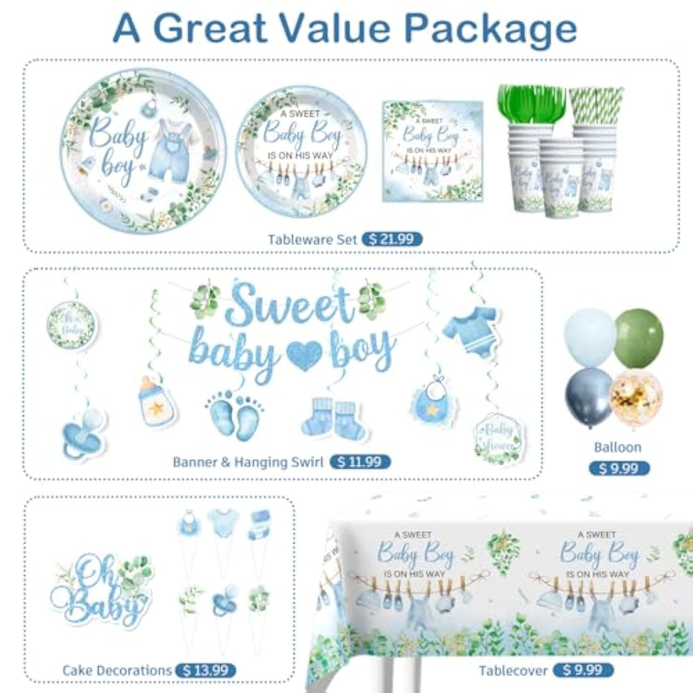 | Baby Boy Shower Decorations Include: 1Pc Cake Topper With 12Pcs Cupcake Toppers, 20Pcs Balloon, 25Pcs 7-Inch A Sweet Baby Boy Is On The Way Plates, 25Pcs 9-Inch Plates, 25Pcs Paper Cups, 25Pcs Napkins, 25Pcs Forks, 25Pcs Paper Straws, 2Pcs 70.8*42.5-Inch Waterproof Tablecloth, 1Pc Sweet Baby Boy Banner, 8 Hanging Swirls, A Total Of 201 Pieces Greenery Style It'S A Boy Baby Shower Party Supplies | | Materials: Baby Shower Decorations Boy Set, All Plates, Cups, Napkins, And Straws Are Made From Food-Grade Paper. The Baby Boy Shower Plates And Cups Are Made Of Durable, Thick 300 Gsm Paper, Which Will Be Sturdy Enough To Hold Drinks And Food. There Is No Need To Worry About The Tears And Flimsy Folds | | Adorable And Colorful Baby Clothes Designs: Baby Boy Shower Plates And Napkins Are Printed With The Text " A Sweet Baby Boy Is On The Way ", And Vivid Greenery Baby Shower Decorations Design, Which Add To A Touch Of Personality To Your Blue Baby Boy Baby Shower Decorations And Tailored For A Boy Baby Shower Celebration | | Easy To Use: Say Goodbye To Post-Party Cleanup Stress! These Baby Boy Shower Decorations Are Disposable, So You Can Easily Clean Up. It Drasti