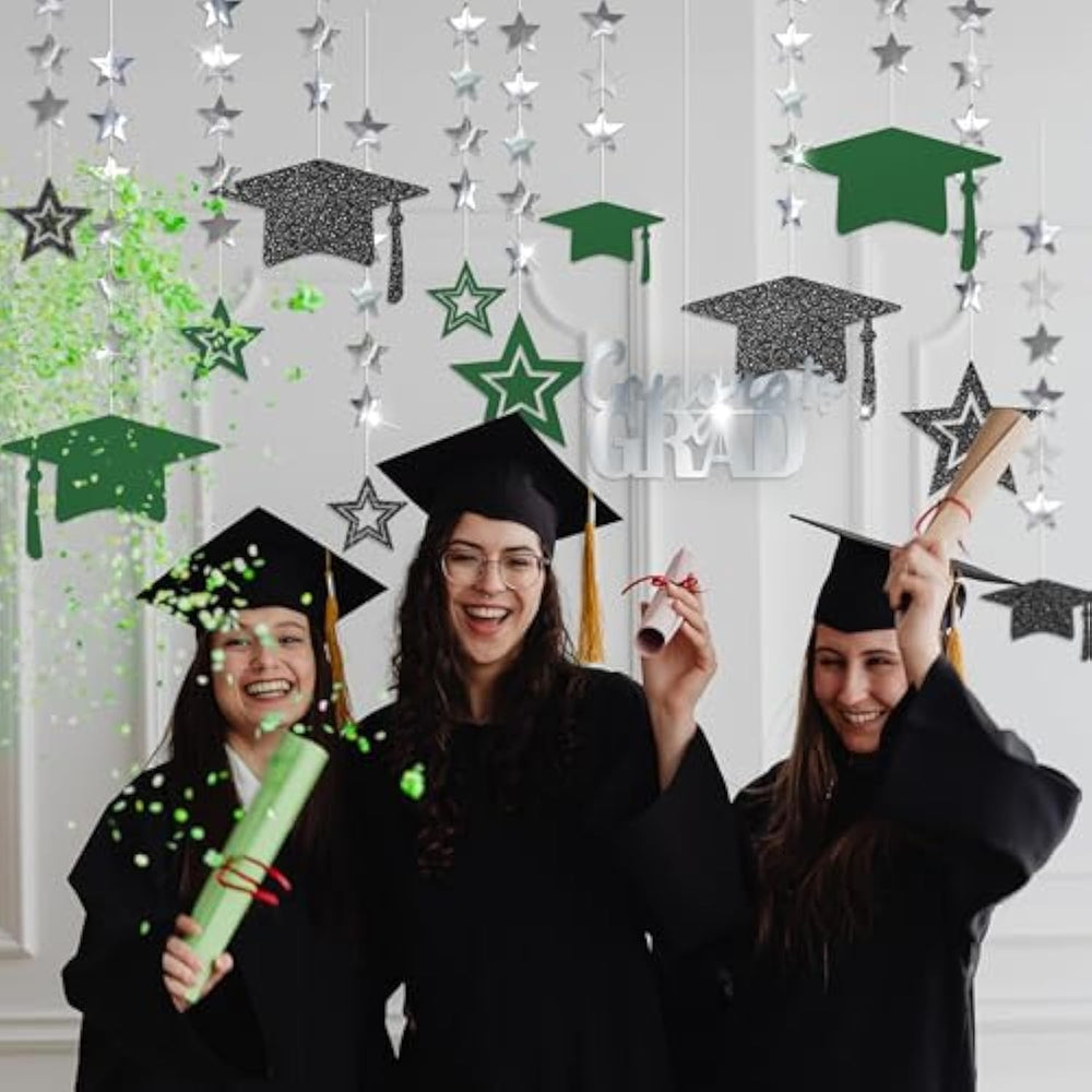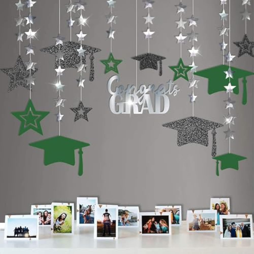Package: This Graduation Party Decoration 2025 Green Kit Features An 11.8" Wide Shining Silver Congrats Grad Banner, 12 Glittering Grad Cap Decorations And Graduation Hanging Decoration Pieces In Black And Green, Totaling 13 Pieces. The Largest Graduation Cap Decoration Measures 9.8 Inches In Width, And The Largest Star Is 6.4 Inches. Also Included Is A Small Roll Of Silver Thread For Easy Hanging. | Exclusivity: Celebrate Graduation 2025 Or Any Special Milestone With Our Dazzling Green Graduation Decorations Set. This Graduation Cap And Star Decor Kit Combines Sleek Black, Elegant Green, And Shimmering Silver To Create The Perfect Graduation Backdrop 2025 For A High School Graduation Decoration Or College Graduation Decorations 2025 Event. | Versatile Themed Decor: Add Sparkle To Your Graduation Party Decorations 2025 With This Grad Cap Streamer And Graduation Garland Set. Perfect For Home Gatherings, High School Graduation Party Decoration, College Festivities, And Graduation Party Decor, It Enhances Any Event, From Kindergarten Graduation Decorations To University Graduation Party Decoration And Beyond. | Guideline: No Diy Required! Simply Take Out The Graduation Hanging Decor Pieces Carefully To Avoid Tangling. Hang The Congrats Grad Banner Green With The Provided Silver Thread. Use It As A Graduation Party Backdrop, Grad Streamer, Or Green Graduation Garland For Your Venue, Whether It'S A School Event, Prom Party Decoration, Or Kindergarten Graduation Party Decoration. | Durable And Eye-Catching: We'Ve Upgraded Our Packaging To Separate Each Grad Decorations 2025 Piece With Opp Bags, Preventing Tangling And Making Setup Hassle-Free. Whether You'Re Decorating For A Class Of 2025 Graduation Decoration, A College Graduation Party Decoration, Or A High School Graduation Party, This Graduation Streamer Set Adds The Perfect Finishing Touch. |