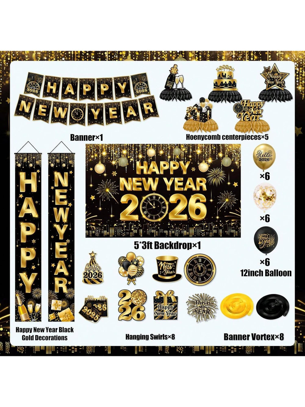 All - in - One new years decor:This new year decorations have everything needed to throw an epic new year eve party. Including new years decoration banner*1; 5*3ft backdrop*1;nye party supplies porch sign banner *2;hanging ceiling*8,table centerpiece*4;balloon*18.It makes it a one - stop solution for new year decorations 2026